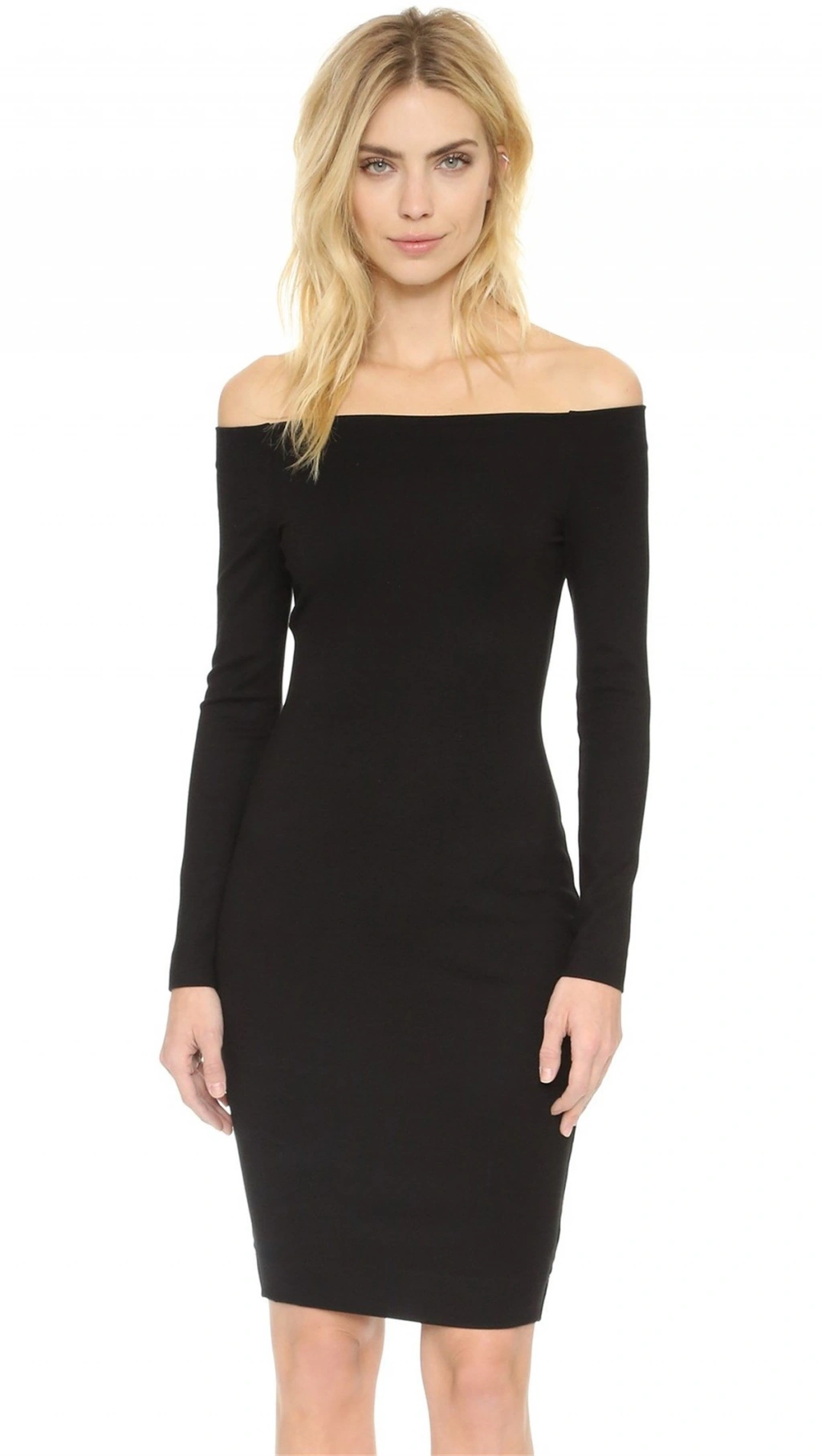 Uzun Kollu straplez elbise. Omuz dekolteli midi elbise. Esnek likralı kumaştan üretilmiştir. Beden ve renk seçenekleri mevcuttur.