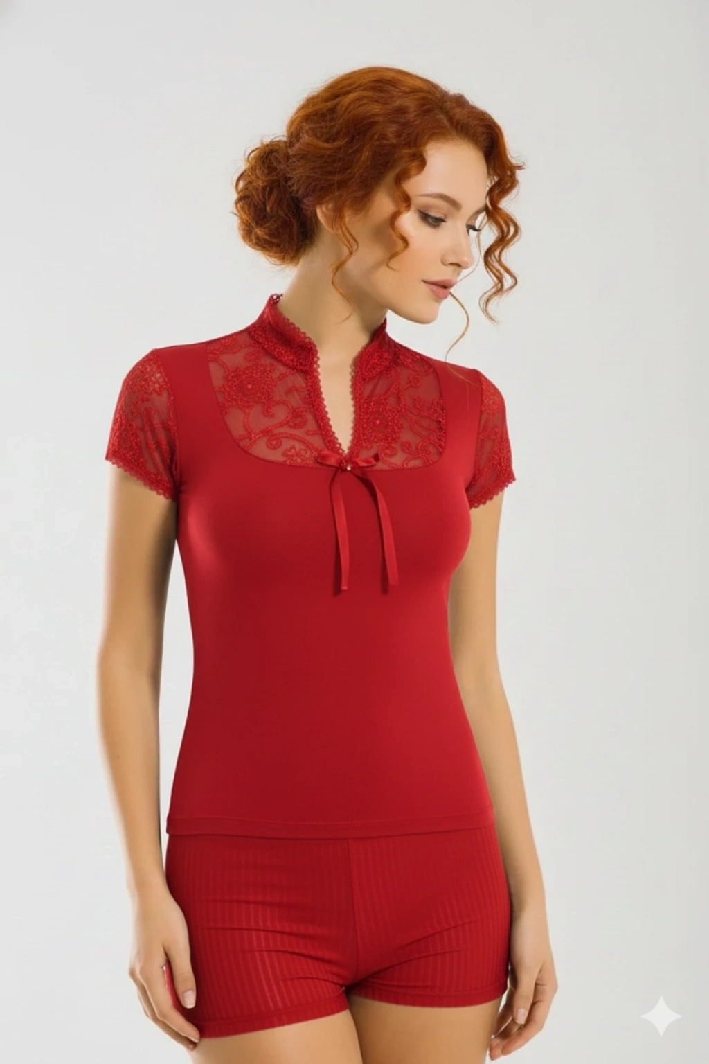 Kadın Kırmızı Siyah Renklerde Önden Üçgen Kesim Detaylı Crop Askılı Önden Bağlama 5092