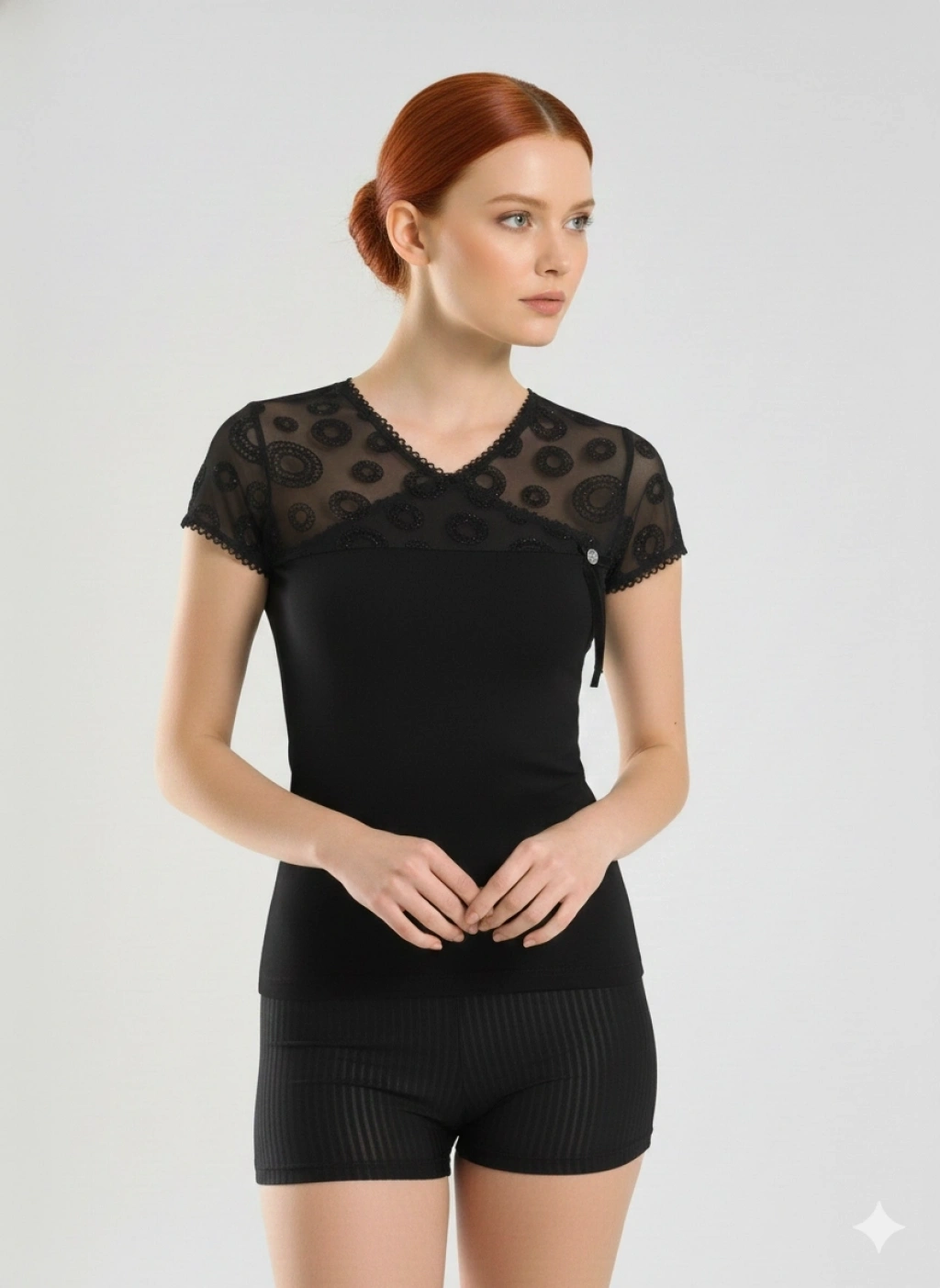 Kadın Siyah Yarım Kol Çapraz Bağlamalı Crop Top Bluz