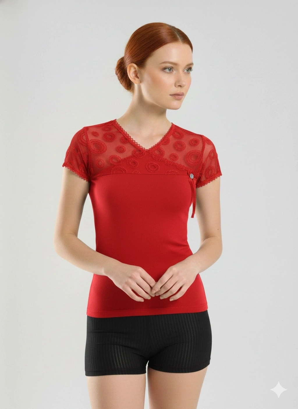 Kadın Kırmızı Siyah Renklerde Önden Üçgen Kesim Detaylı Crop Askılı Önden Bağlama 5092