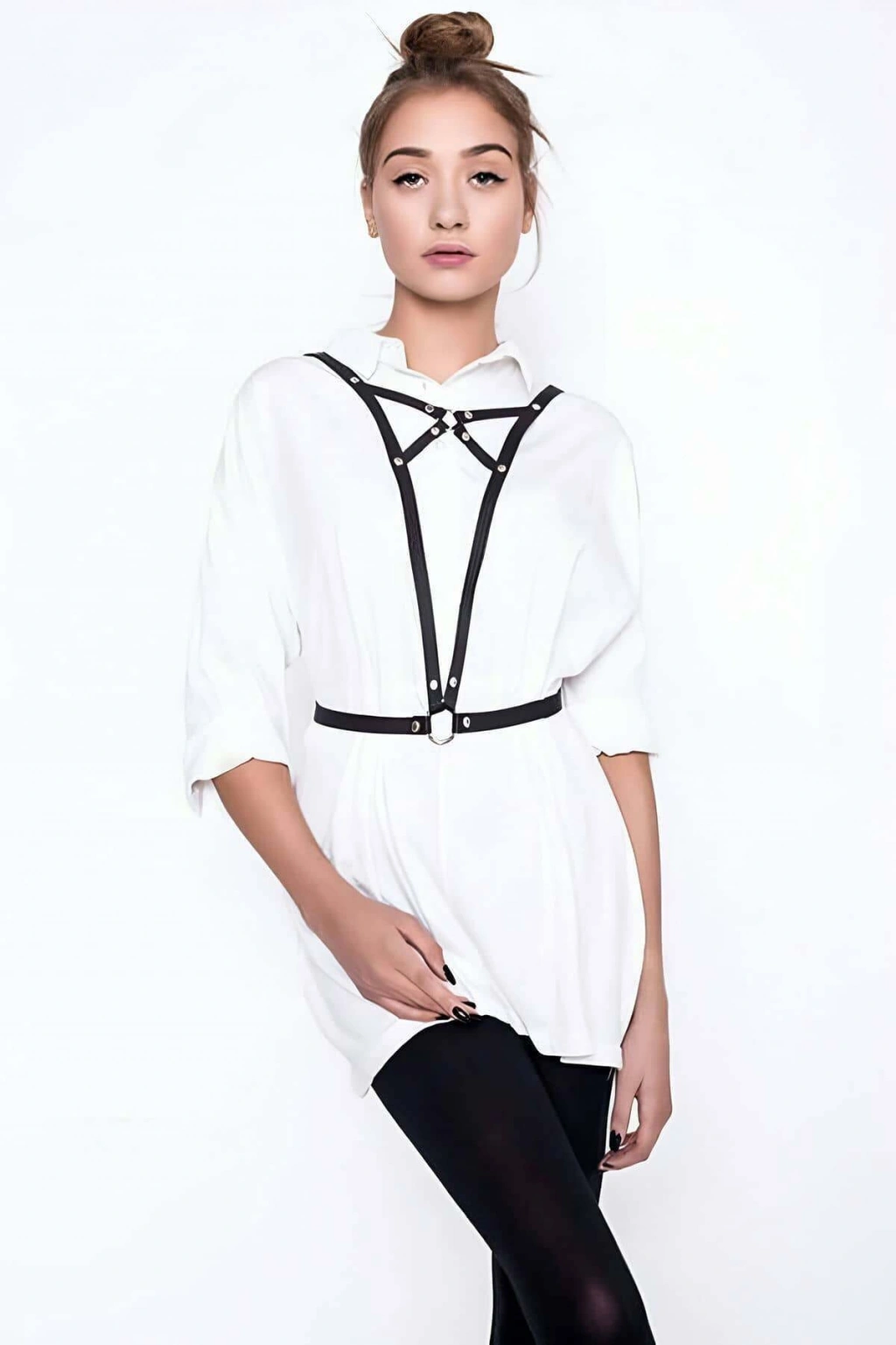 Siyah Göğüs Harness Kadın Suni Deri Metal Halka Detaylı - Brf25