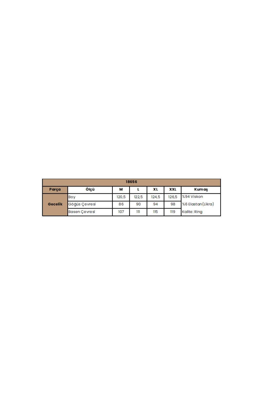 Gecelik: Beyaz renklidir, derin V Yakalıdır, sırt ve göğüs dekoltelidir, kalın askılıdır, yakası,askı kenarları ve sırtı dantellidir, yırtmaçlıdır, örme kumaştır.