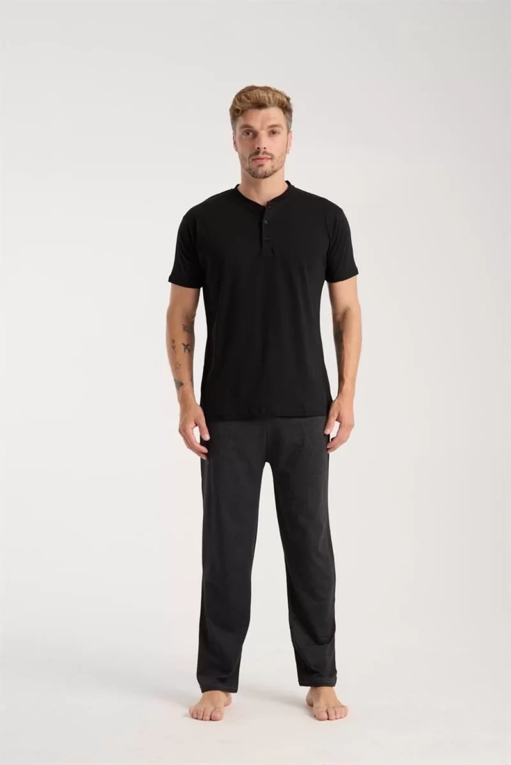 Çamaşır Kenti'nin şık ve konforlu Erkek Füme Düğmeli Yaka Kısa Kol Pijama Takımı, rahat bir gece uykusu için ideal bir seçenektir.