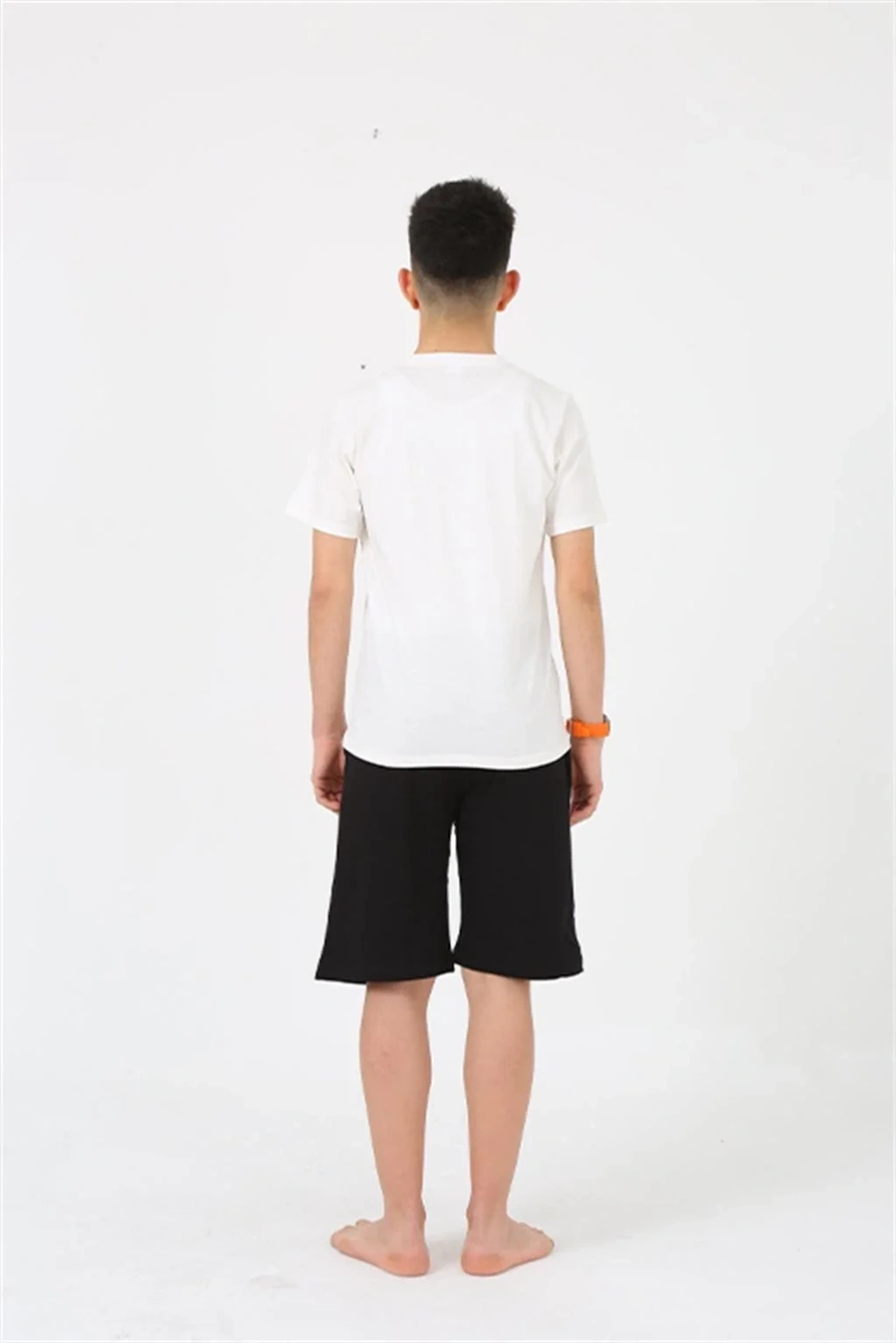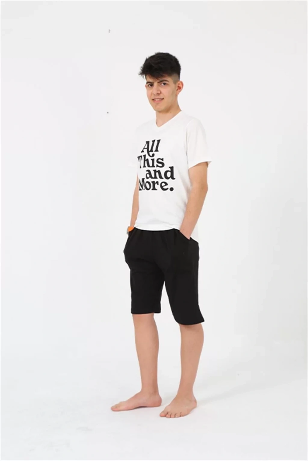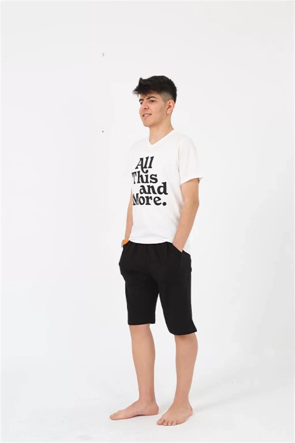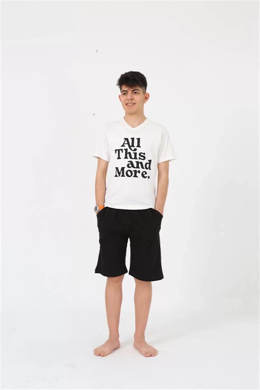 Erkek Genç Garson Boy Kısa Kol Ekru Penye Şortlu Pijama Takımı ile tarzınızı yansıtın, konforun tadını çıkarın.