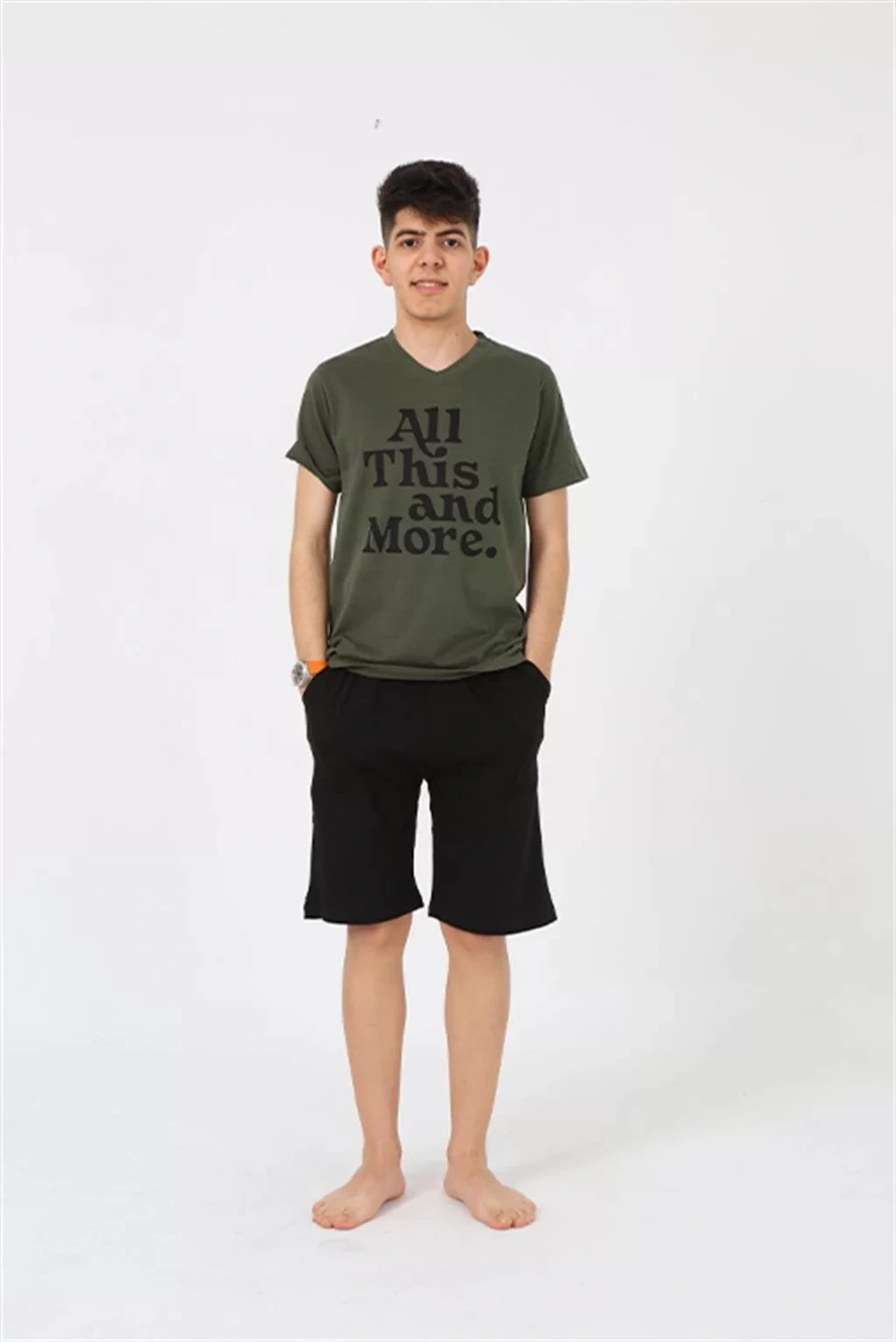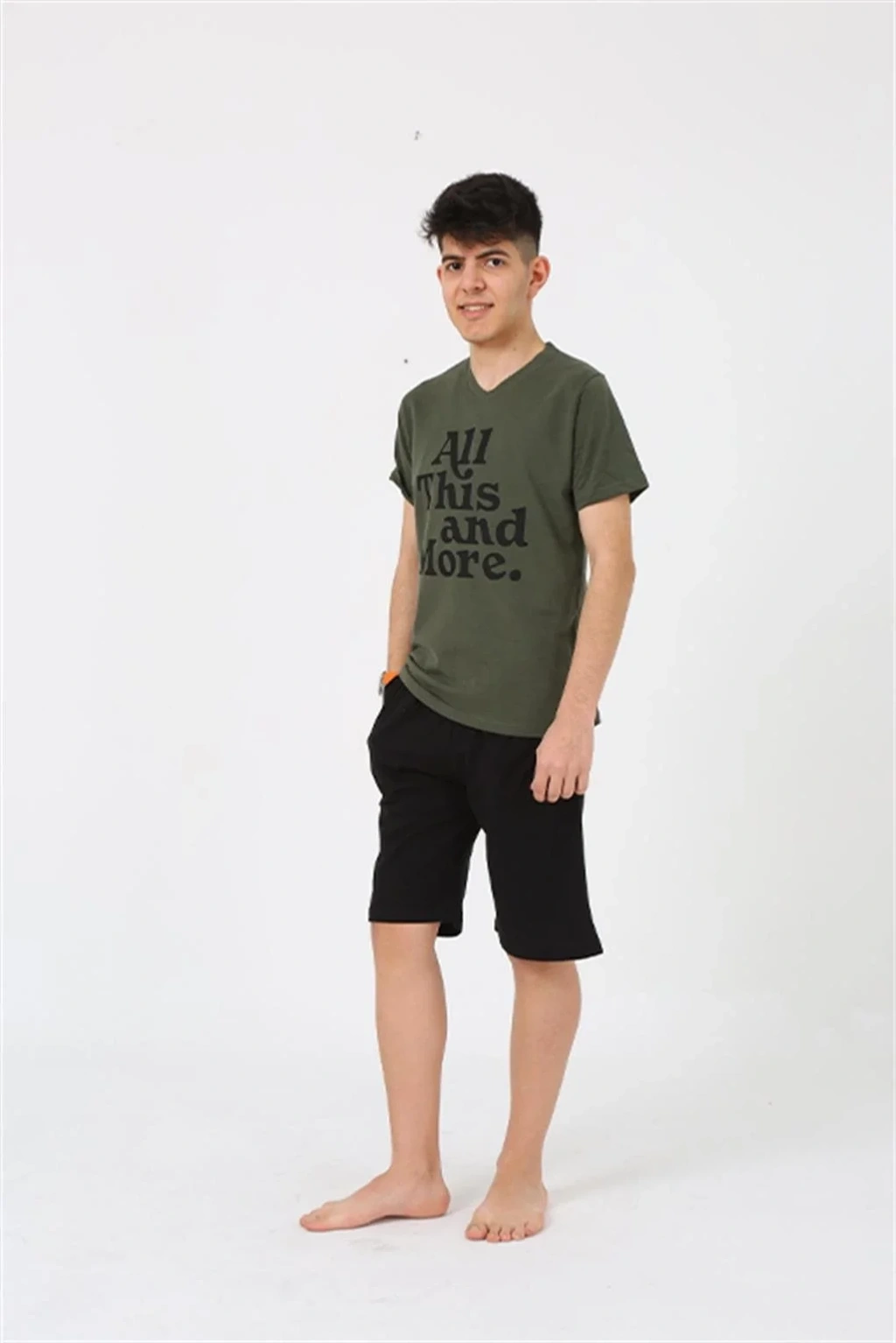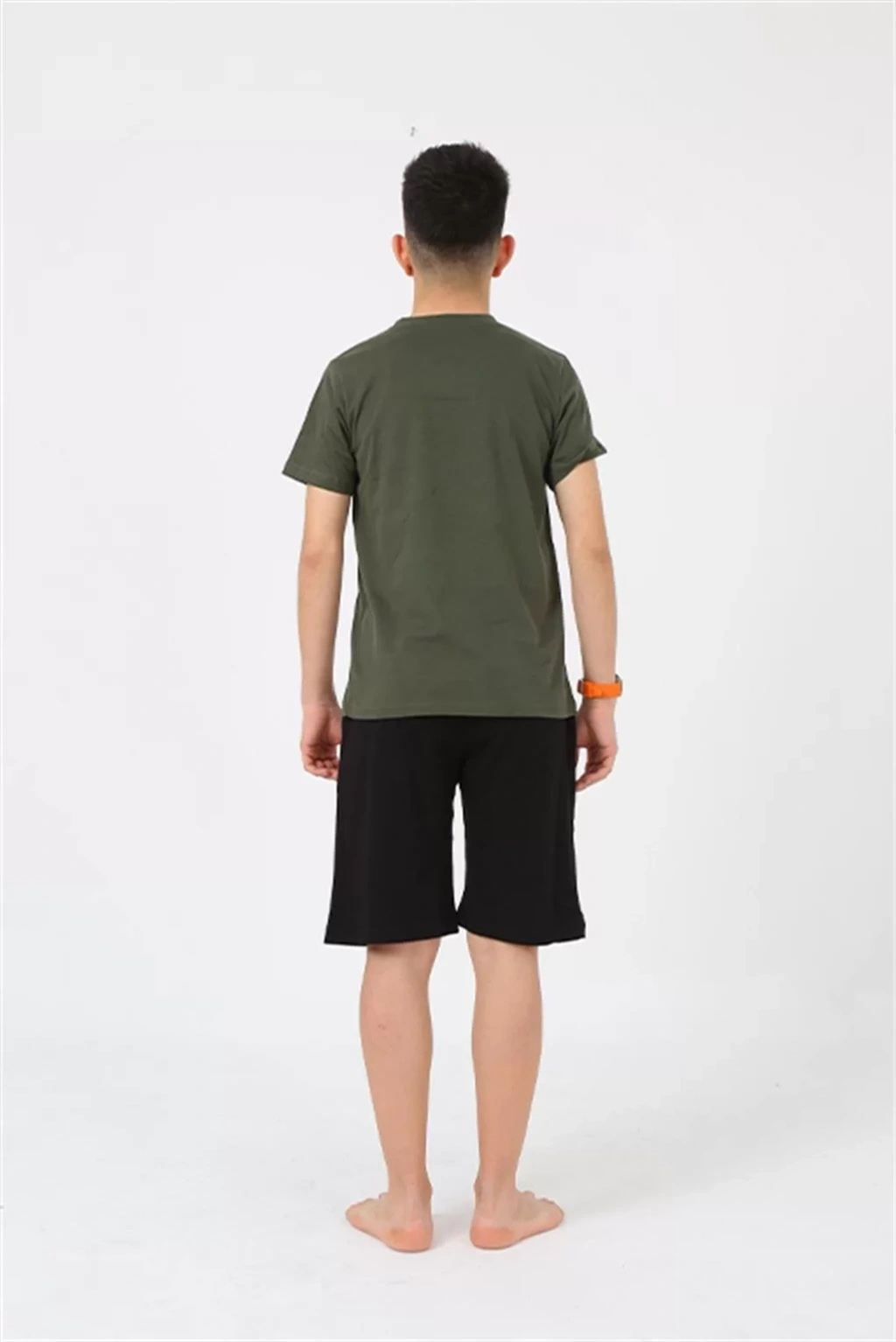 Erkek Genç Garson Boy Kısa Kol Haki Penye Şortlu Pijama Takımı ile tarzınızı yansıtın, konforun tadını çıkarın.