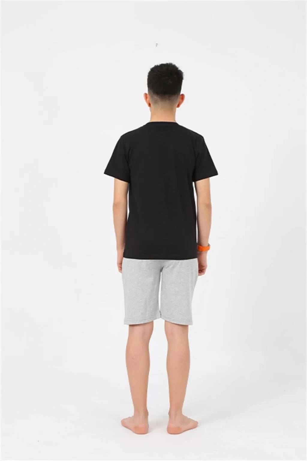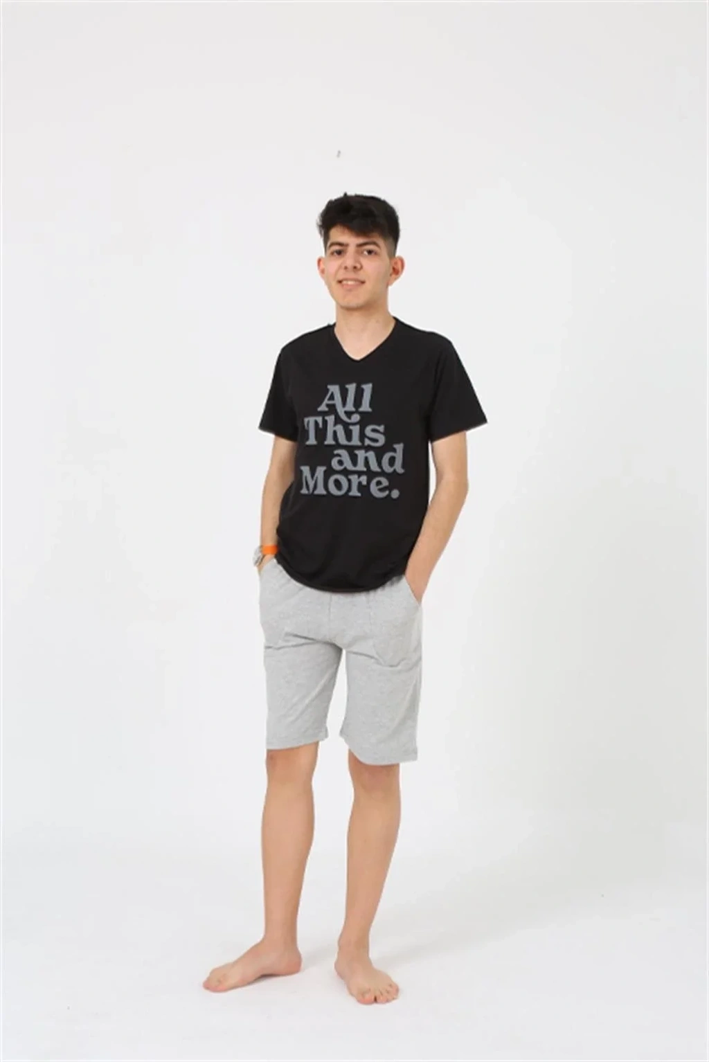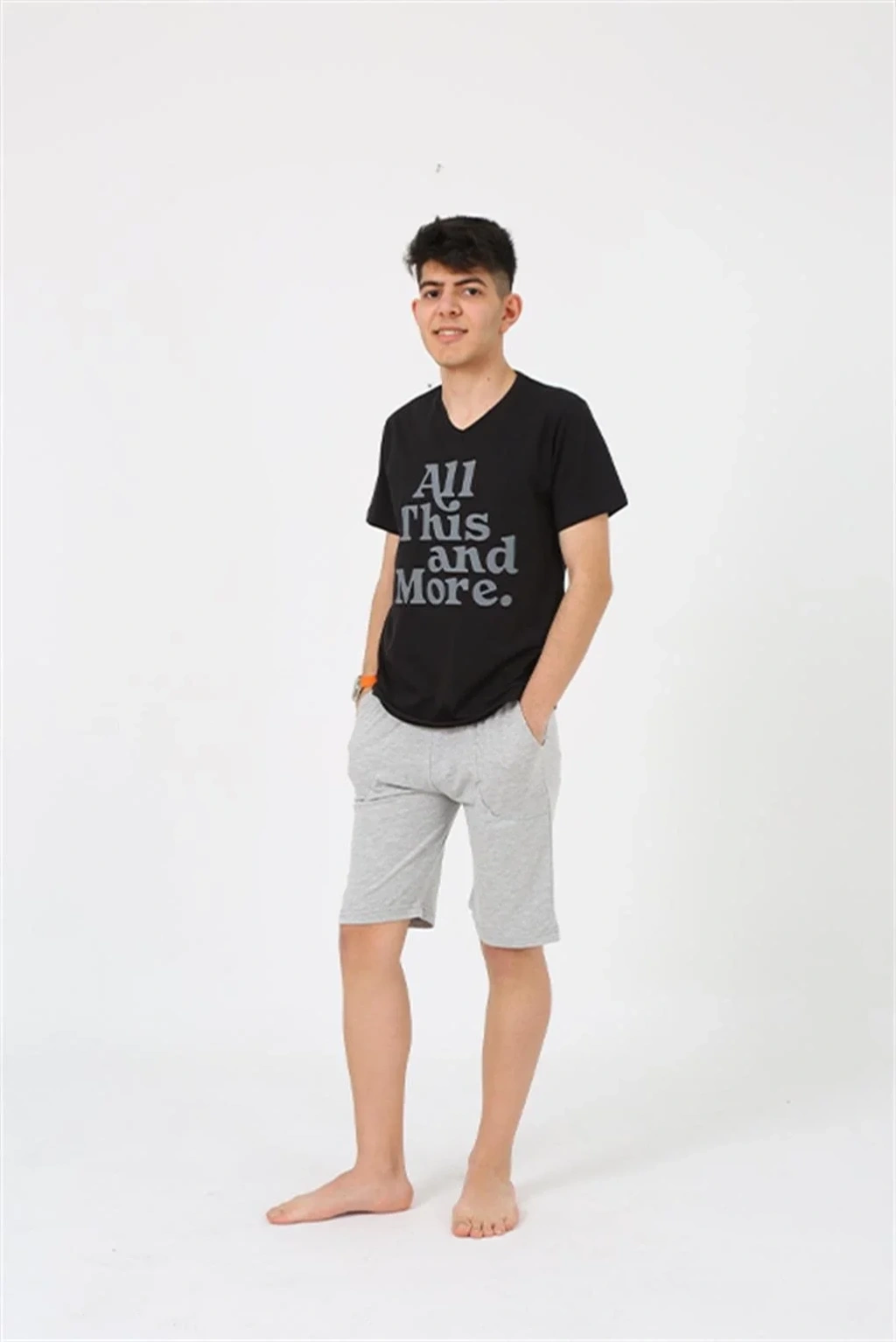 Erkek Genç Garson Boy Kısa Kol Siyah Penye Şortlu Pijama Takımı ile tarzınızı yansıtın, konforun tadını çıkarın.