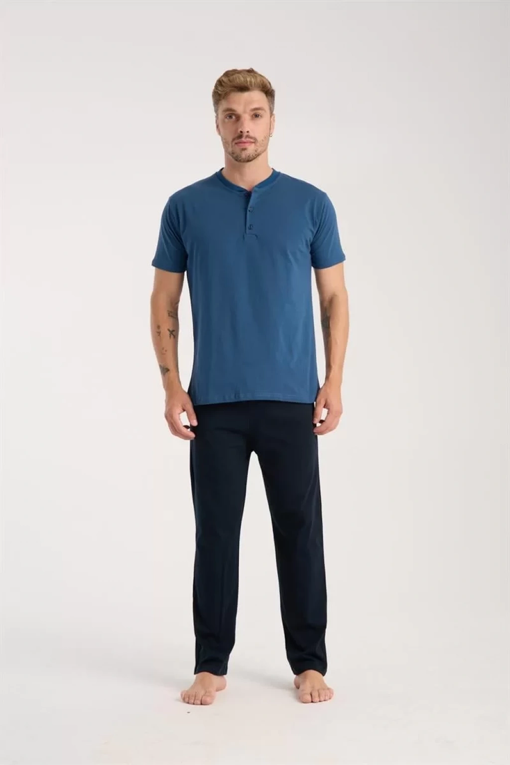 Erkek İndigo Düğmeli Yaka Kısa Kol Pijama Takımı ile hem şık hem de rahat bir gece geçirebilir, günün yorgunluğunu üzerinizden atabilirsiniz.