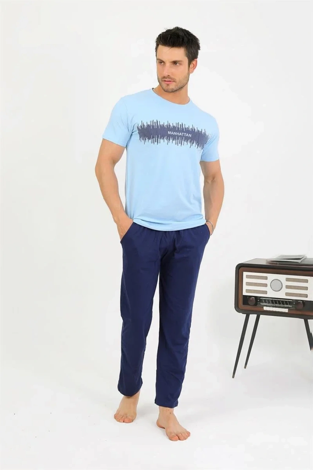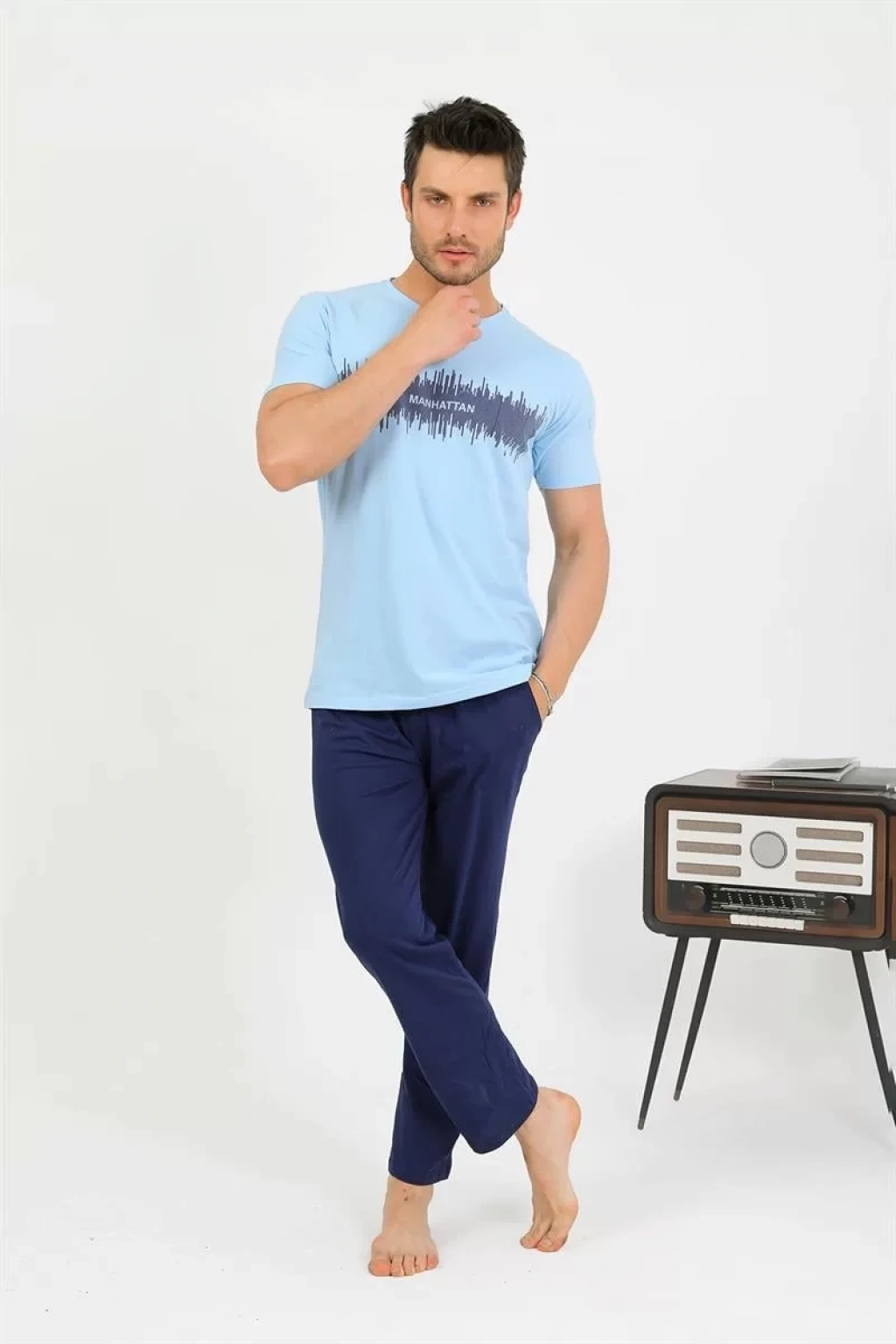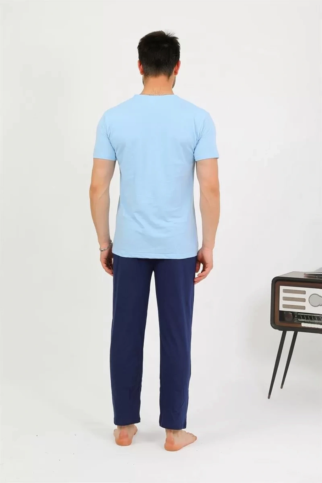 Çamaşır Kenti'nin mavi rengindeki erkek pamuk kısa kol pijama takımıyla rahatlığı ve tarzı bir arada bulacaksınız.