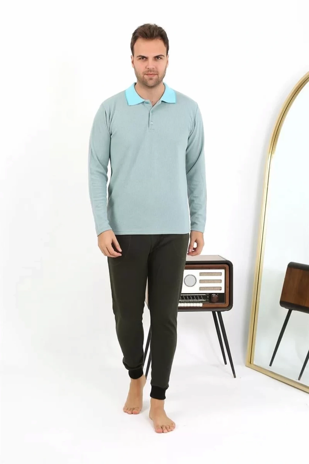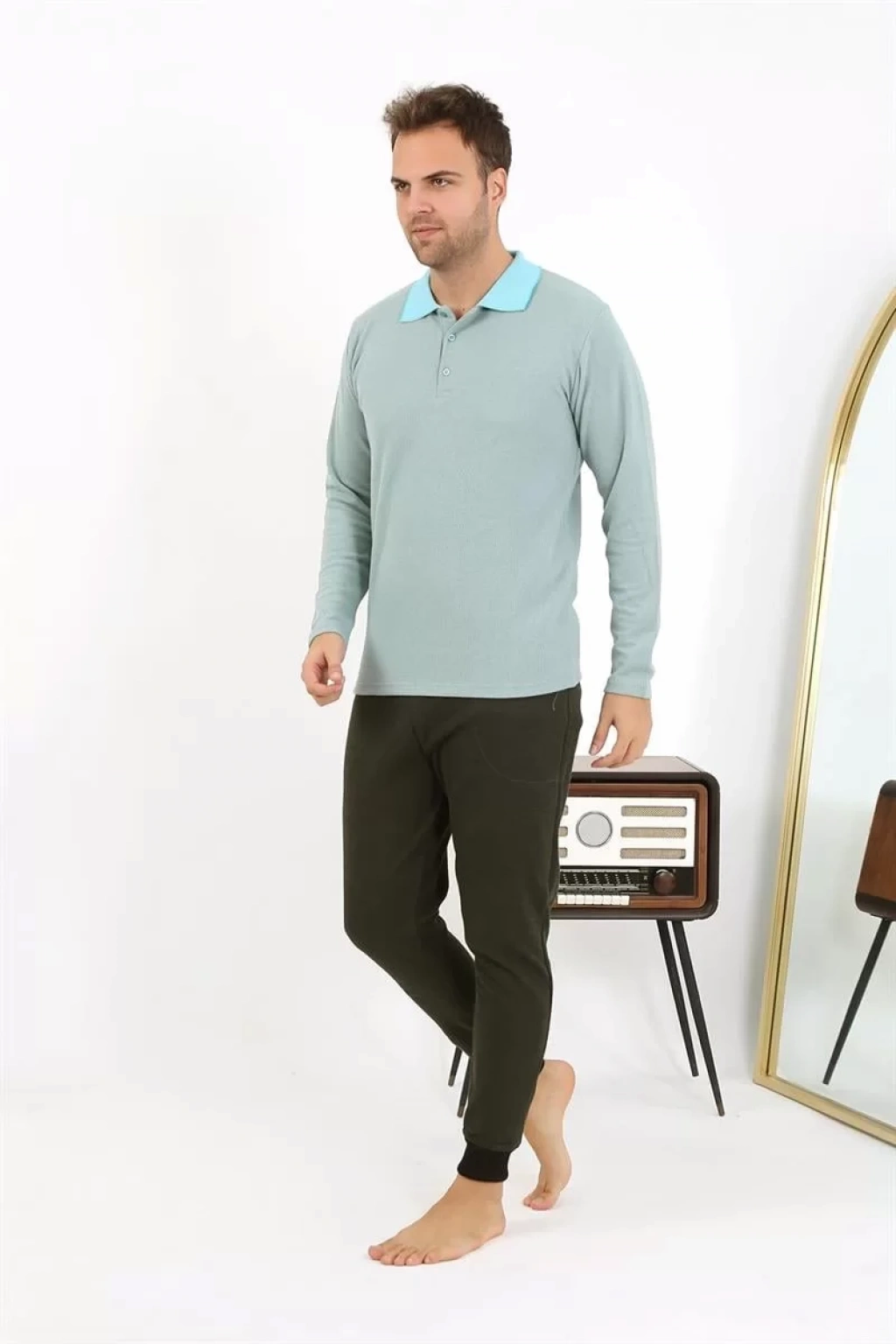 Erkek Polo Yaka Uzun Kol Penye Pijama Takımı Su Yeşili, hem evde rahatça dinlenirken hem de uyurken stilinizi konuşturmanızı sağlar. Kaliteli malzemesiyle uzun ömürlü bir kullanım vadediyor.