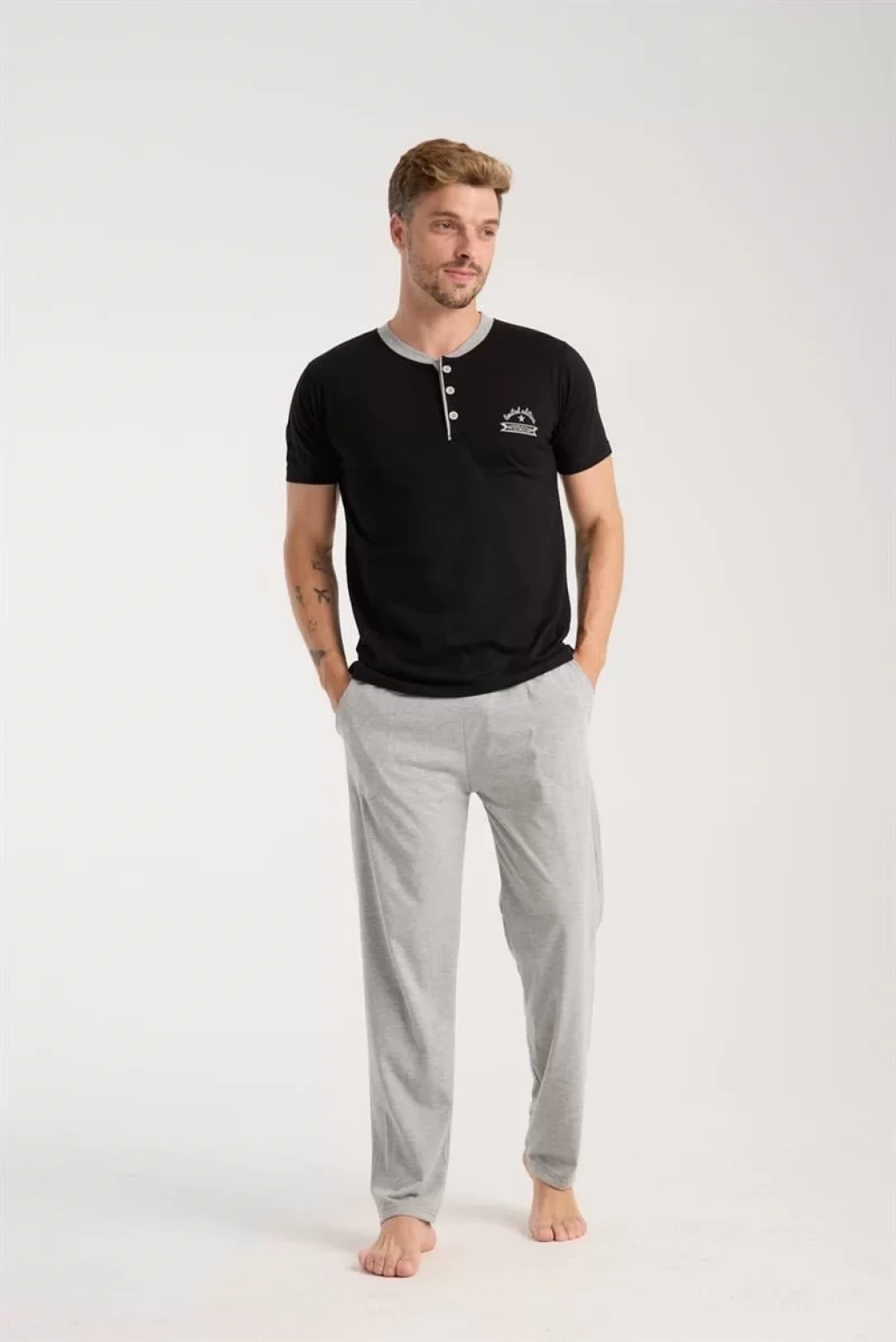 Şıklığı ve konforu bir arada sunan erkek siyah düğmeli yaka kısa kol pijama takımı, günlük kullanım için ideal bir seçenektir.