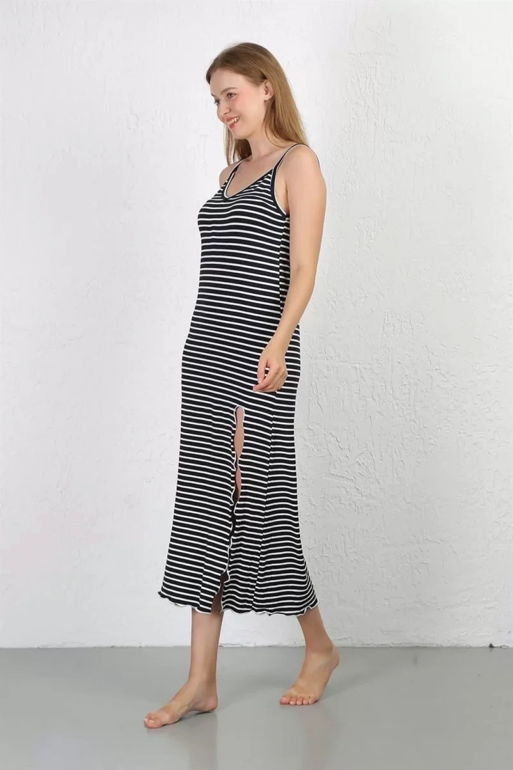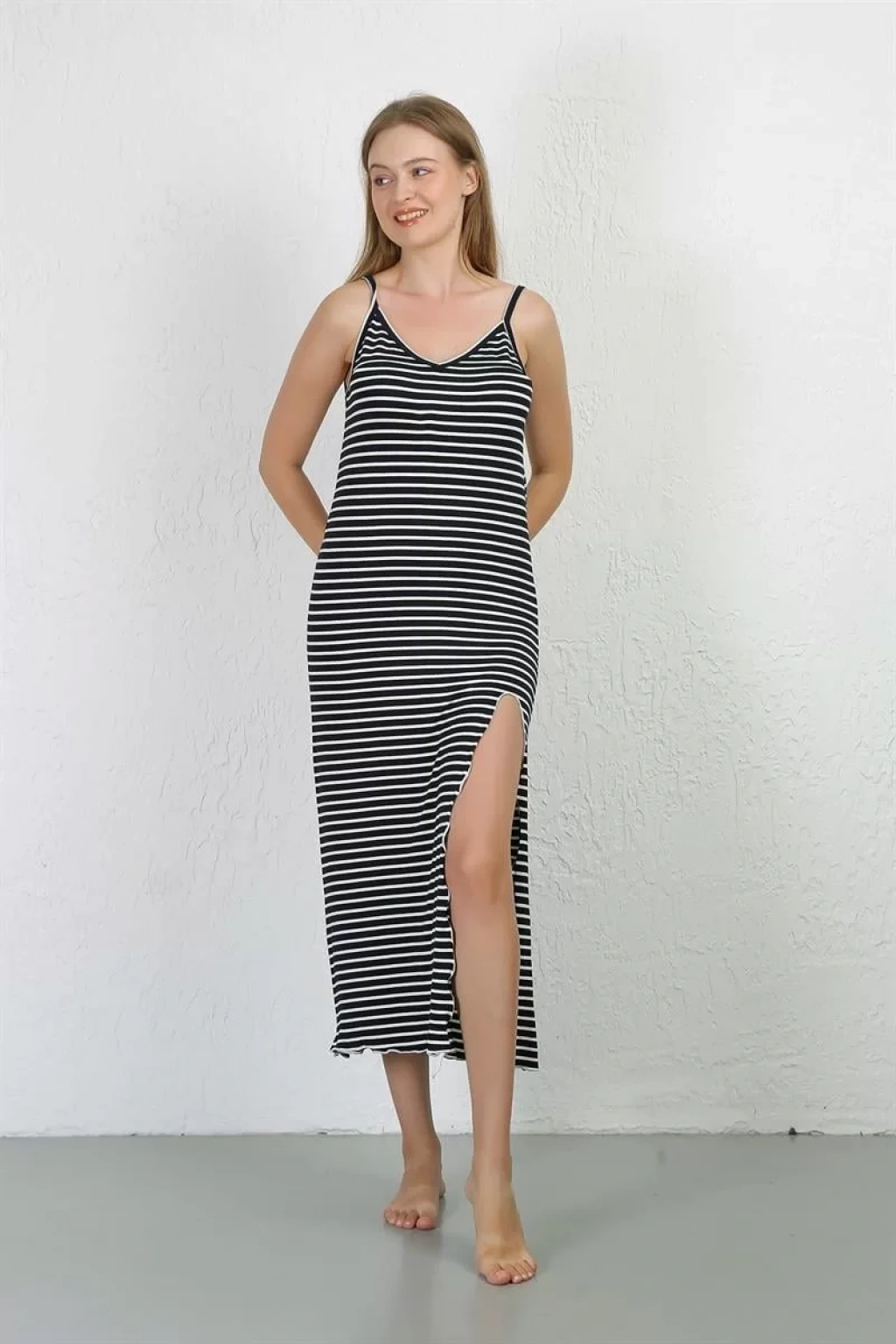 Çamaşır Kenti İp Askılı Uzun Yırtmaçlı Penye Gecelik ile hem şık hem de rahat bir gece geçirin.