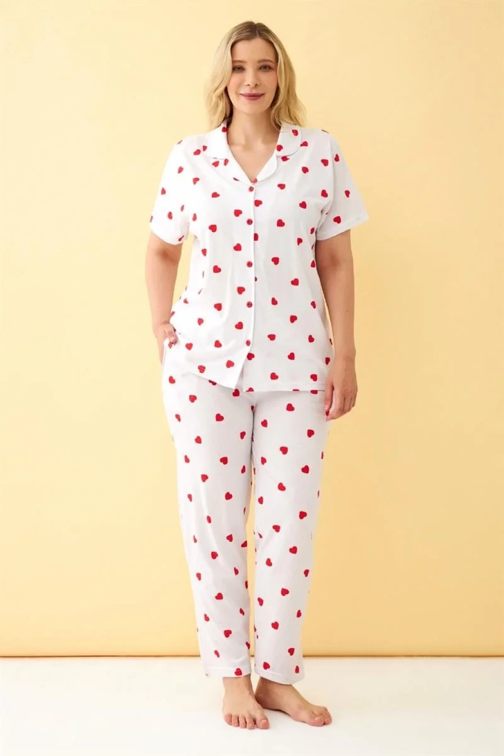 Çamaşır Kenti'nin büyük beden kadın pijama takımı, şık ve konforlu tasarımıyla dikkat çekiyor. Beyaz ve kırmızı renklerin uyumuyla öne çıkan pijama takımı, kalp desenleriyle de oldukça şirin bir görünüme sahip.