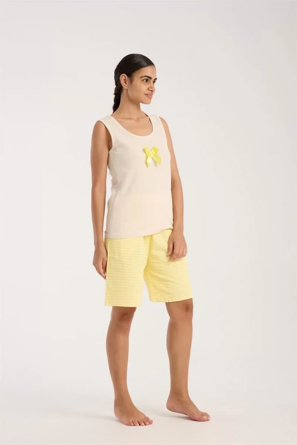 şıklık ve konforu bir arada sunan Kadın Beyaz Kurdele Detaylı Sarı Çizgili Şortlu Pijama Takımı, rahat bir gece geçirmeniz için tasarlandı.