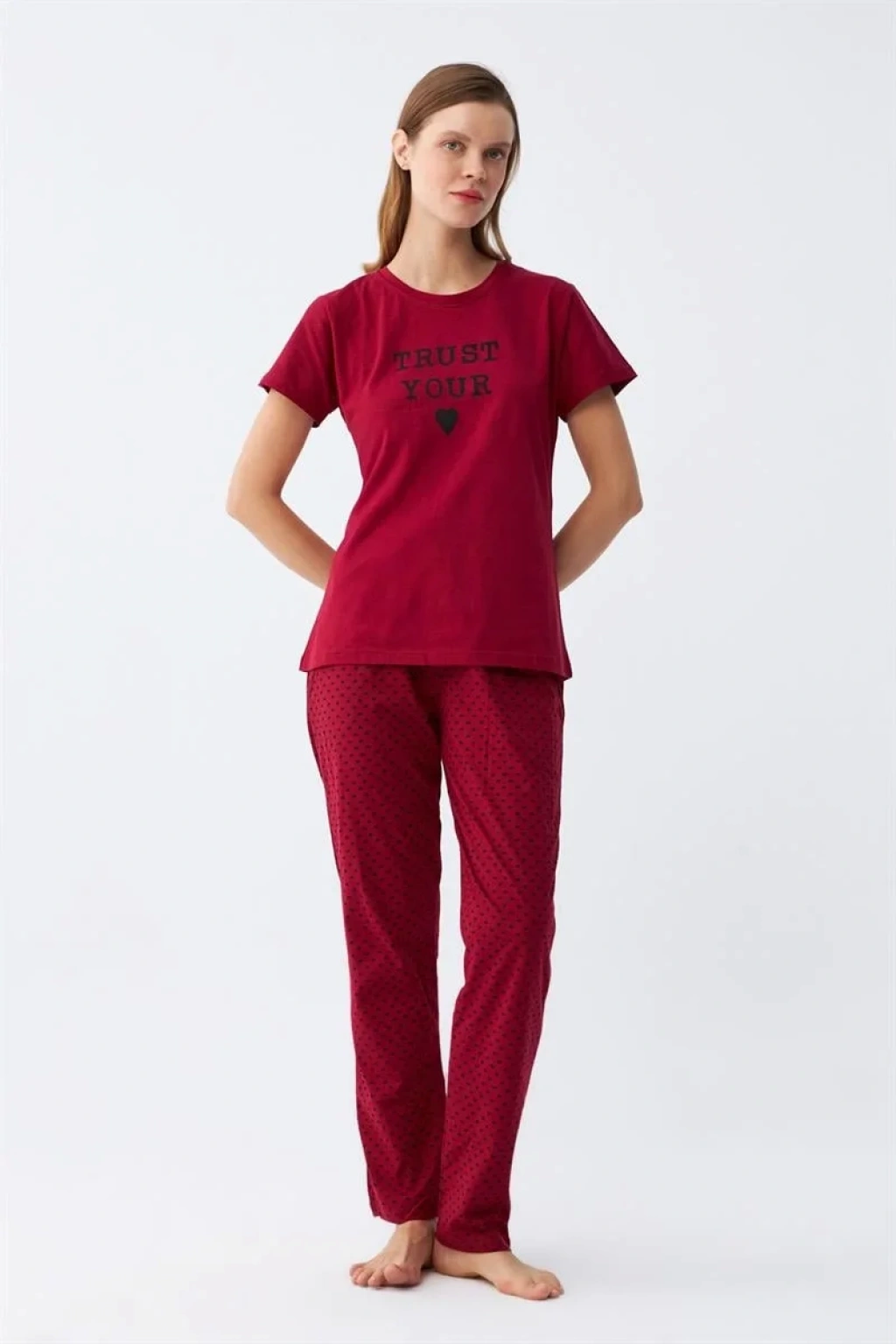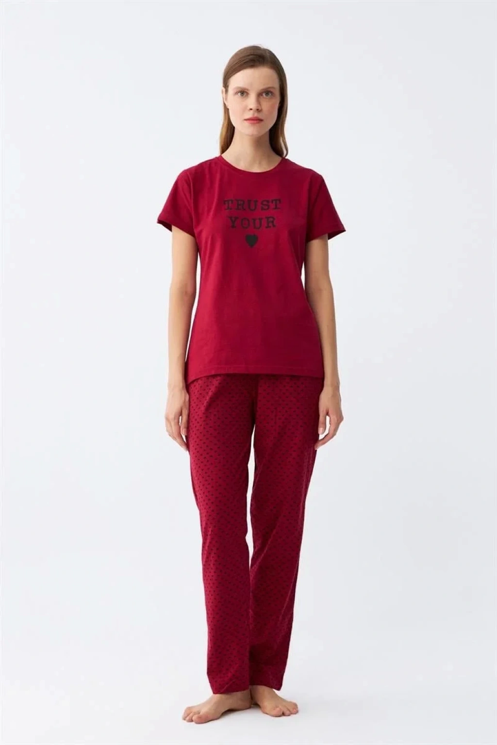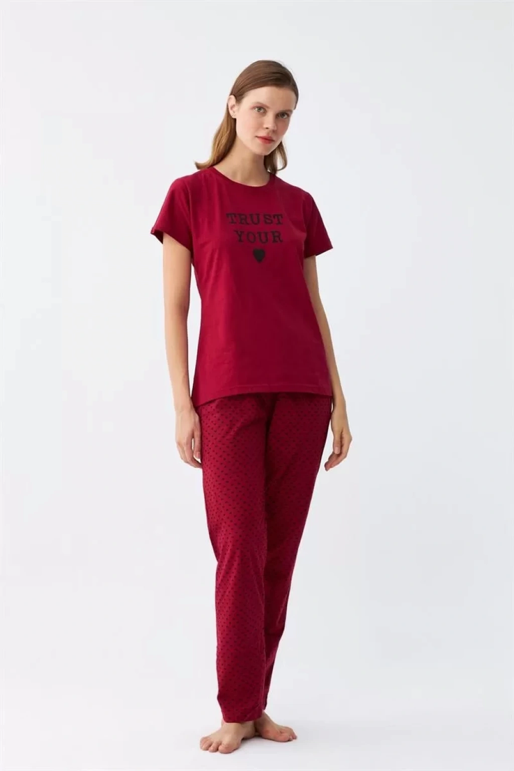 Şimdi Kadın Bordo Kalp Desenli Kısa Kollu Penye Pijama Takımı ile gece keyfinizi arttırabilirsiniz.