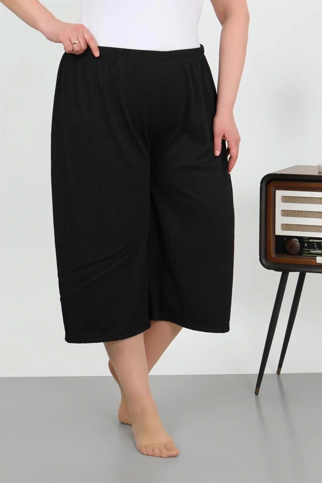 'in siyah renkli büyük beden bürümcük kaprisi ile tarzınızı konuşturun! Kadın Büyük Beden Bürümcük Kapri 27561Siyah, şıklığı ve rahatlığı bir arada sunar. 'in kalitesiyle öne çıkan bu ürün, tarzınıza tarz katmak için ideal.