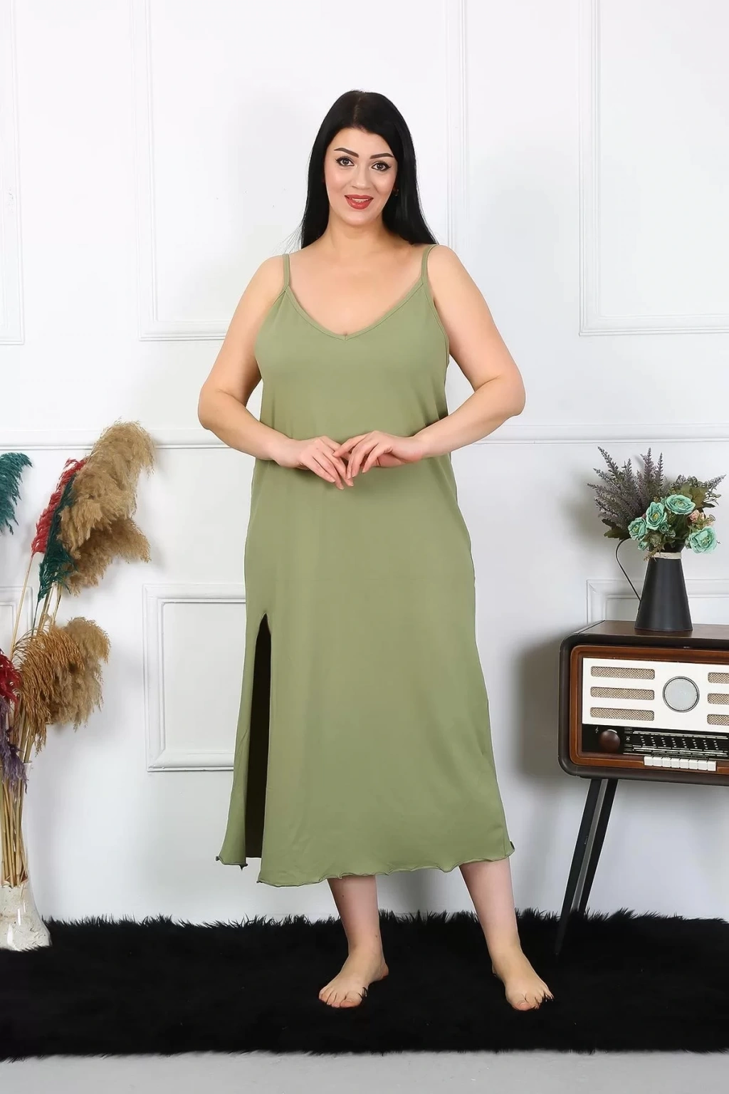 Çamaşır Kenti Kadın Büyük Beden İp Askılı Pamuklu haki Uzun Gecelik, rahatlığı ve şıklığı bir arada sunar.