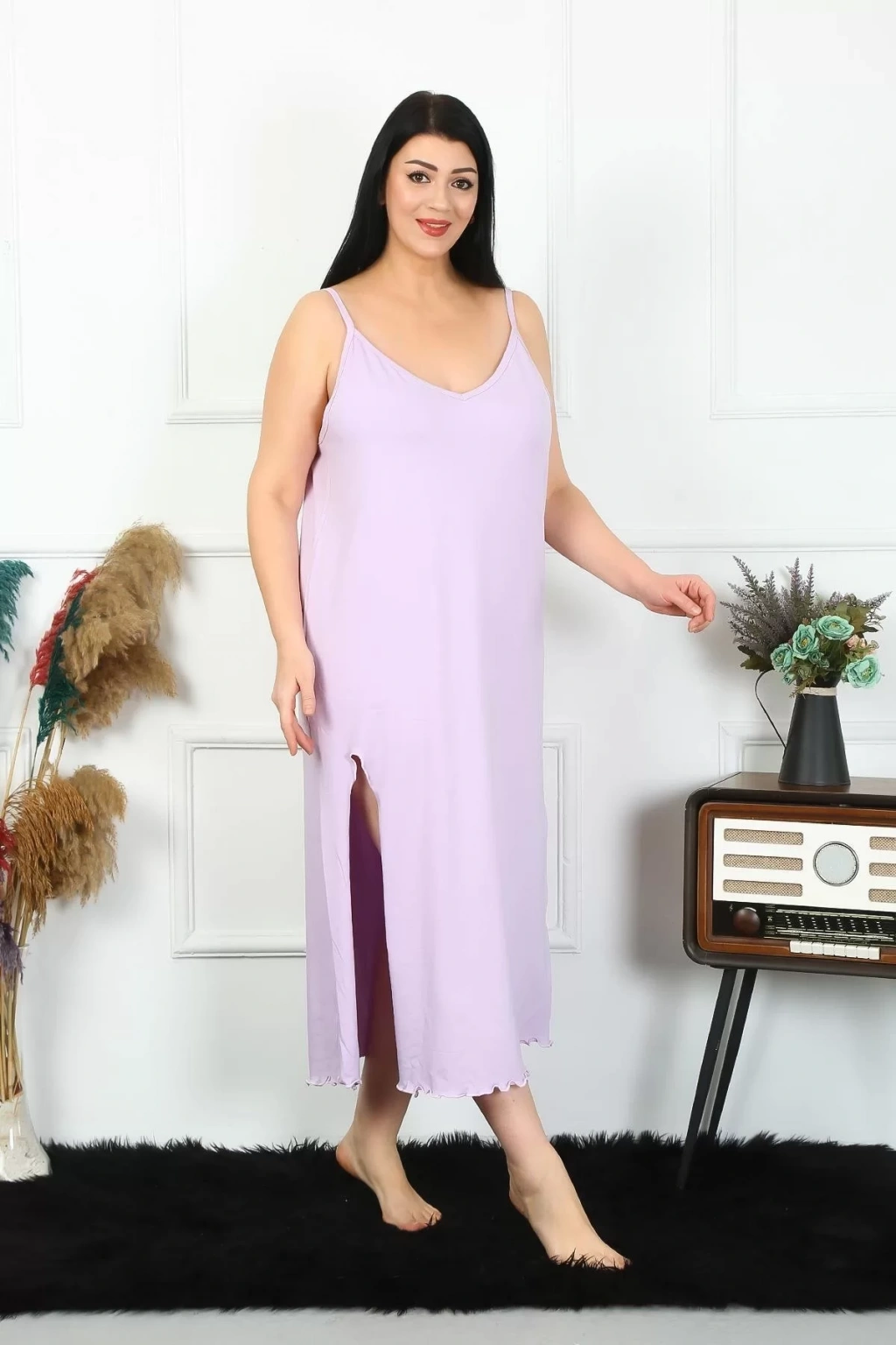 Çamaşır Kenti Kadın Büyük Beden İp Askılı Pamuklu Lila Uzun Gecelik, rahatlığı ve şıklığı bir arada sunar.