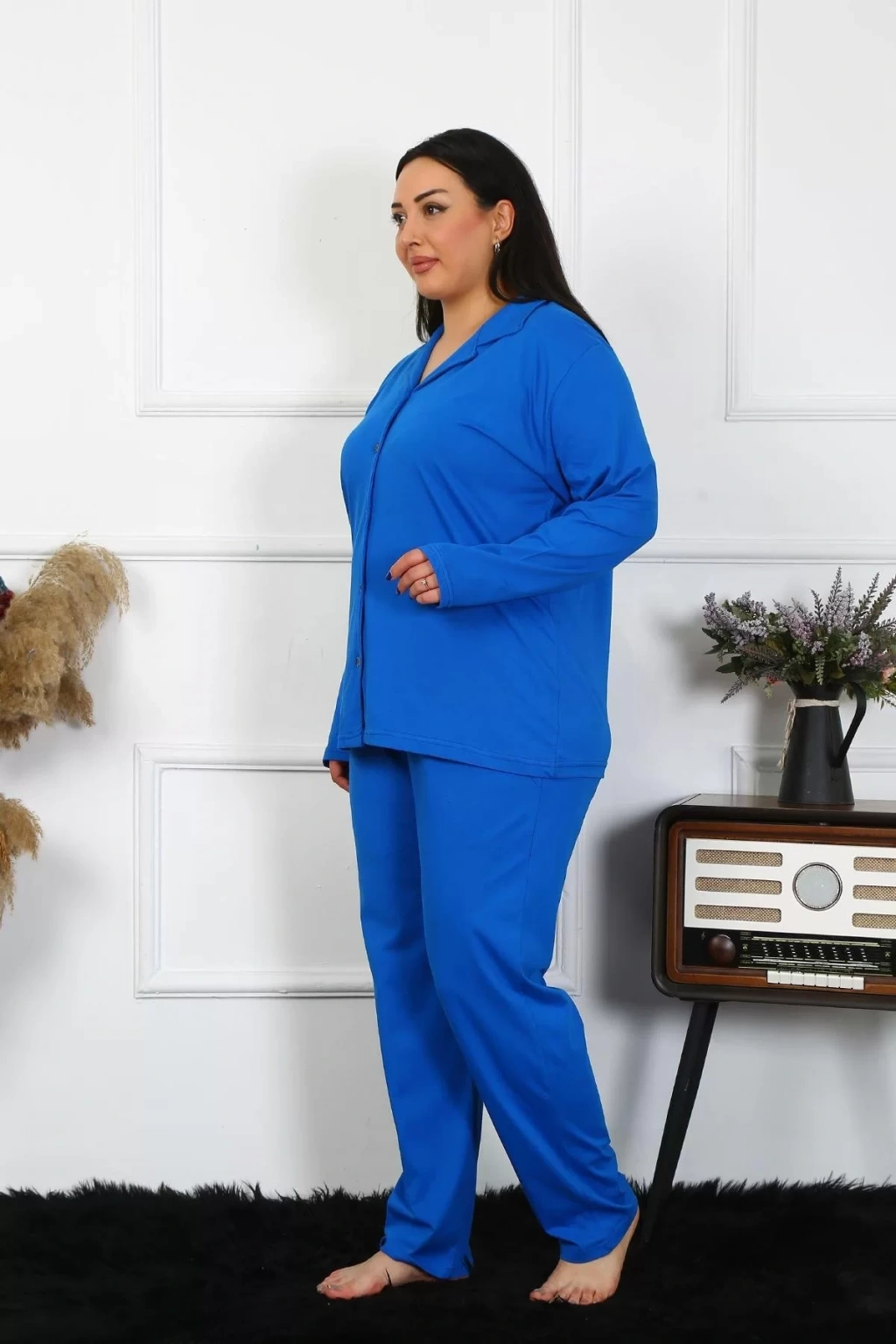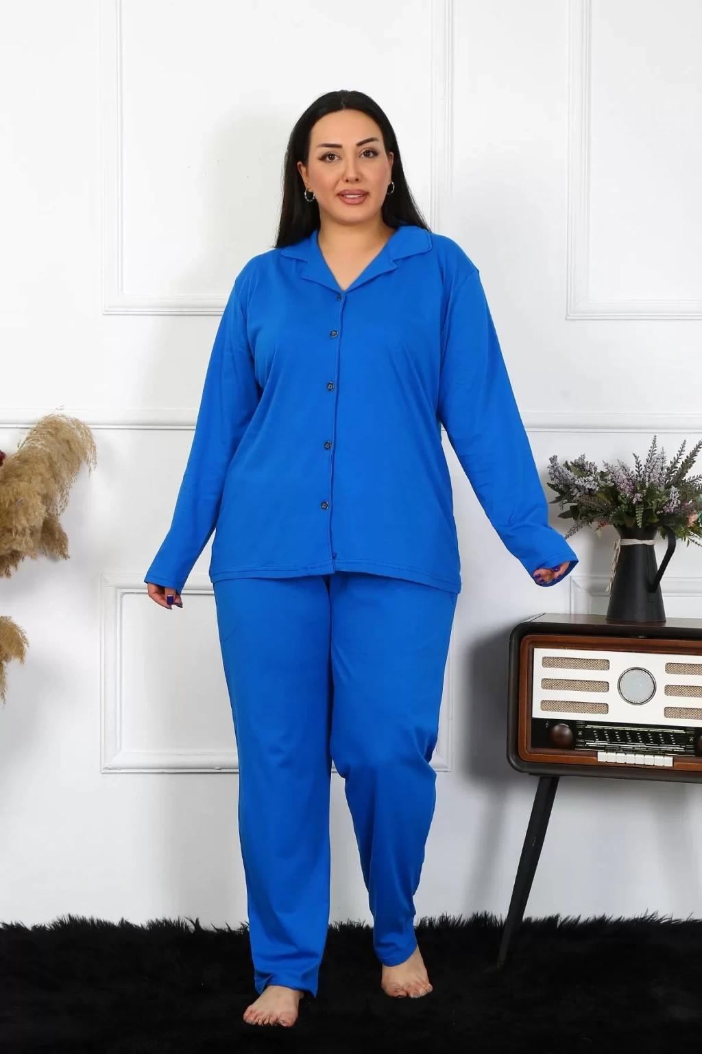 Çamaşır Kenti markası tarafından özenle tasarlanan Kadın Büyük Beden Pamuklu Cepli Düğmeli Saks Pijama Takımı, şıklığı ve rahatlığı bir arada sunar.
