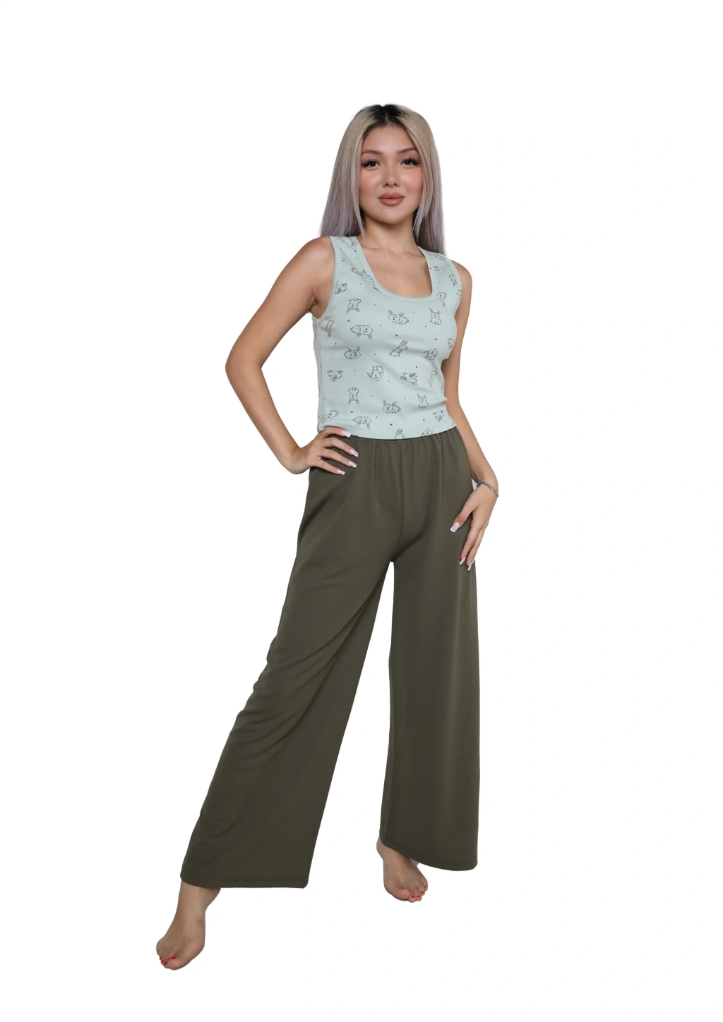 Bu harika takım ile her ortamda dikkatleri üzerinize çekmeye hazır olun. Çamaşır Kenti kalitesi ve şıklığı ile Kadın Kalın Askılı Body Bol Paça Pantolon 2'li Takım Su Yeşili, şimdi sizi bekliyor!