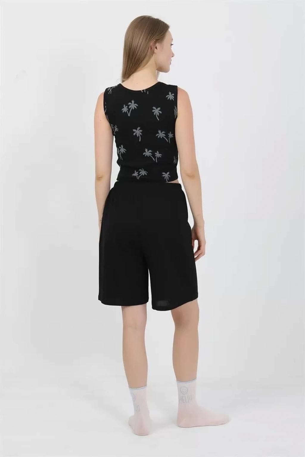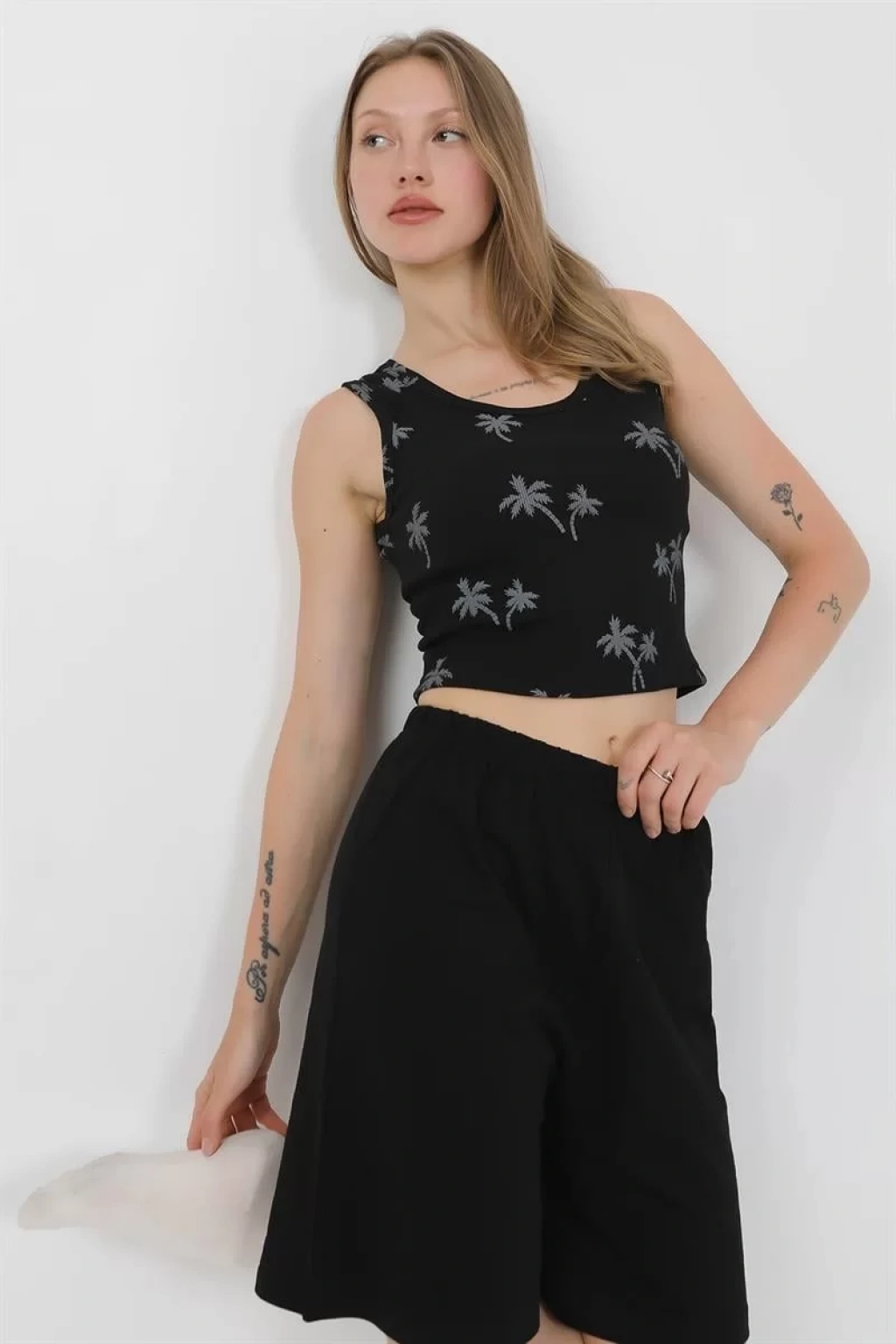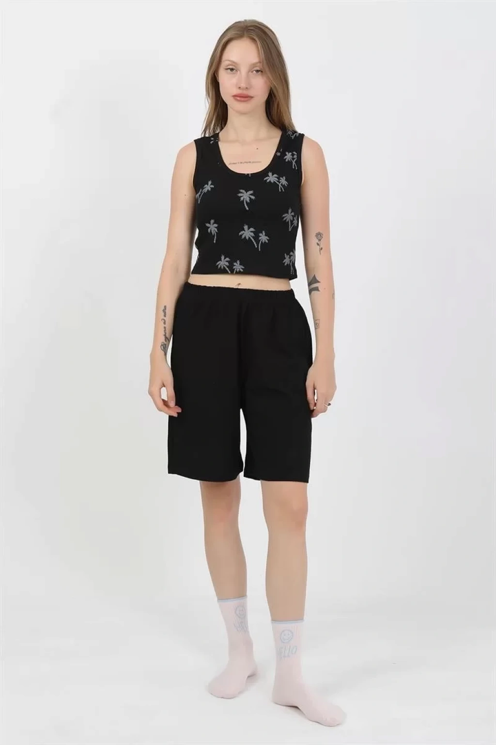 - Kalın askılı üst parça ve şortlu alt parça ile şık bir kombinasyon sunar.