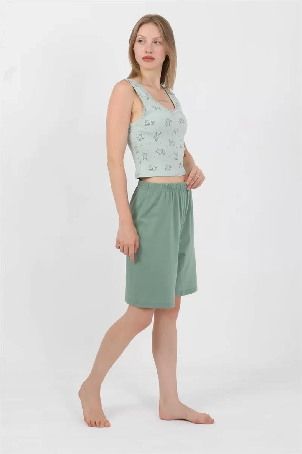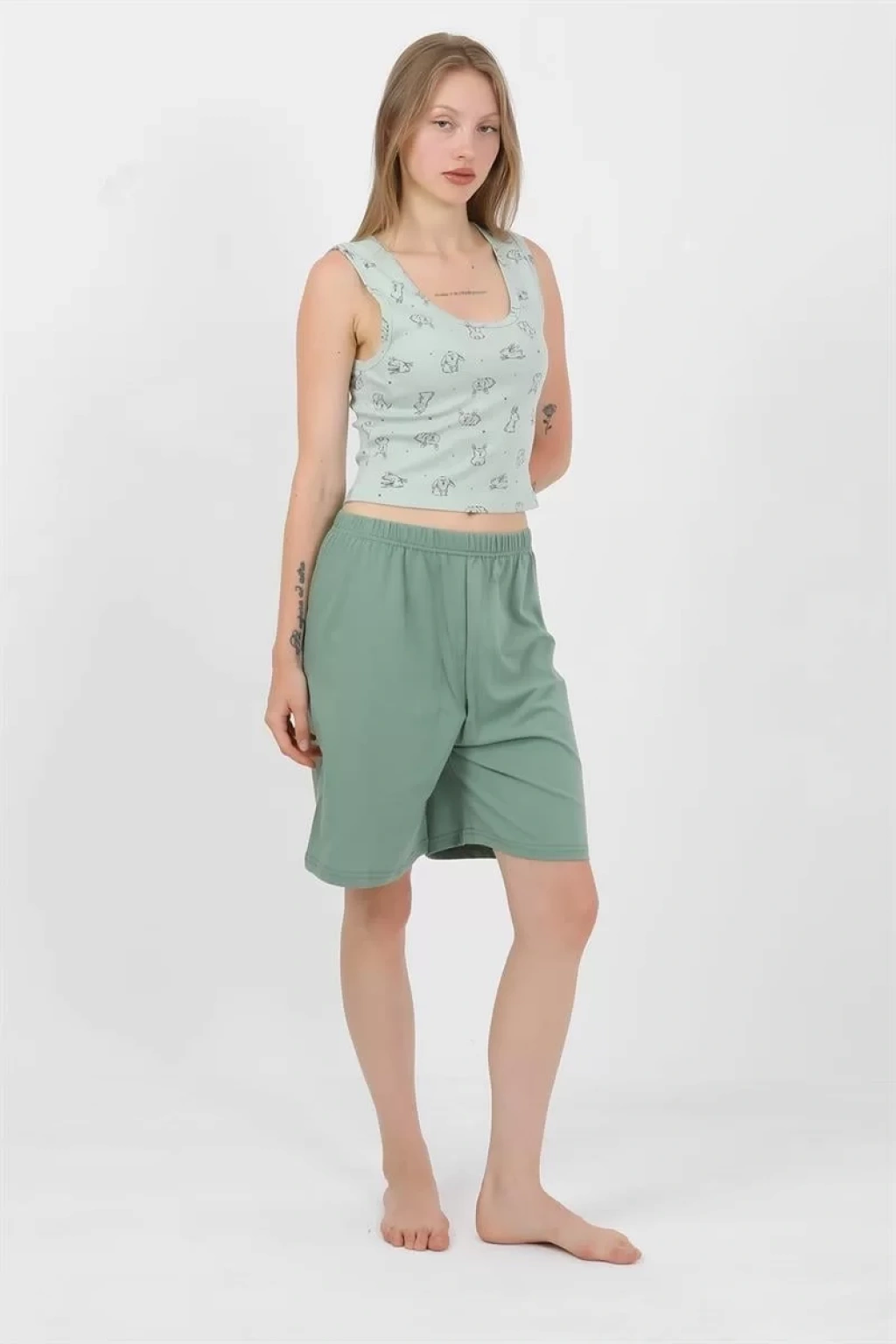Şıklığı ve rahatlığı bir arada arayan kadınların tercihi olan bu takım, günlük kullanımdan özel günlerde de şık bir seçenek olacak. Kadın Kalın Askılı Pamuk Penye Şortlu Crop Takım SuYeşili, tarzınızı yansıtmak istediğiniz her an size eşlik etmeye hazır.