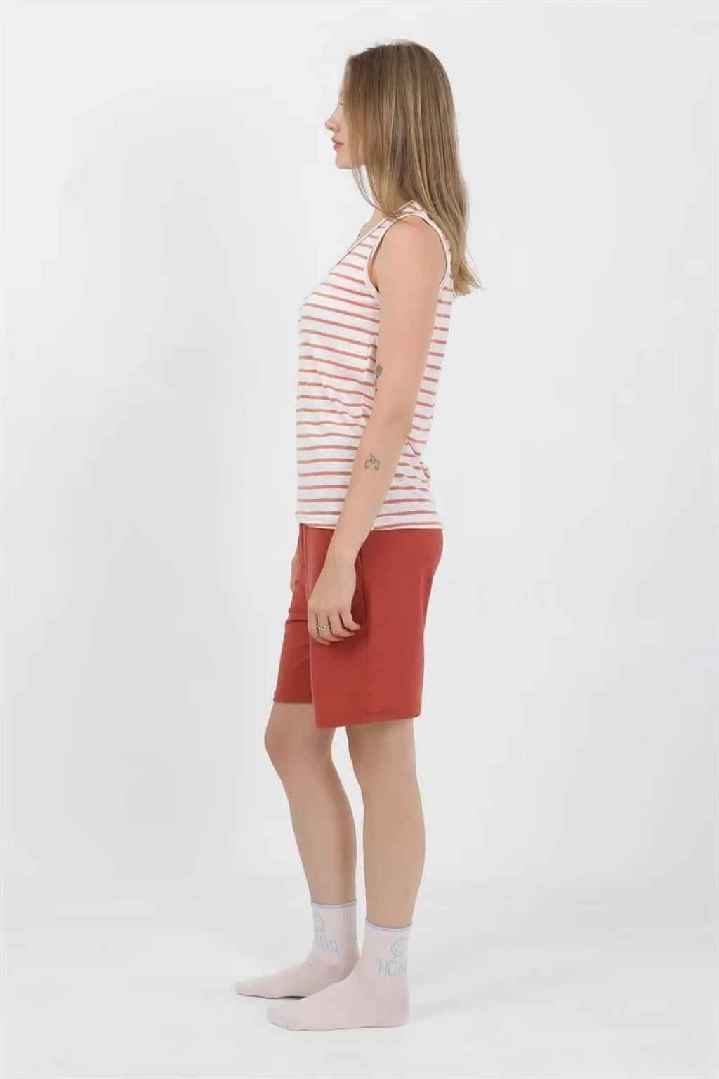 Kadın Kalın Askılı Pamuk Penye Şortlu Takım Turuncu, hem şık hem de rahat bir kombin oluşturmanızı sağlar.