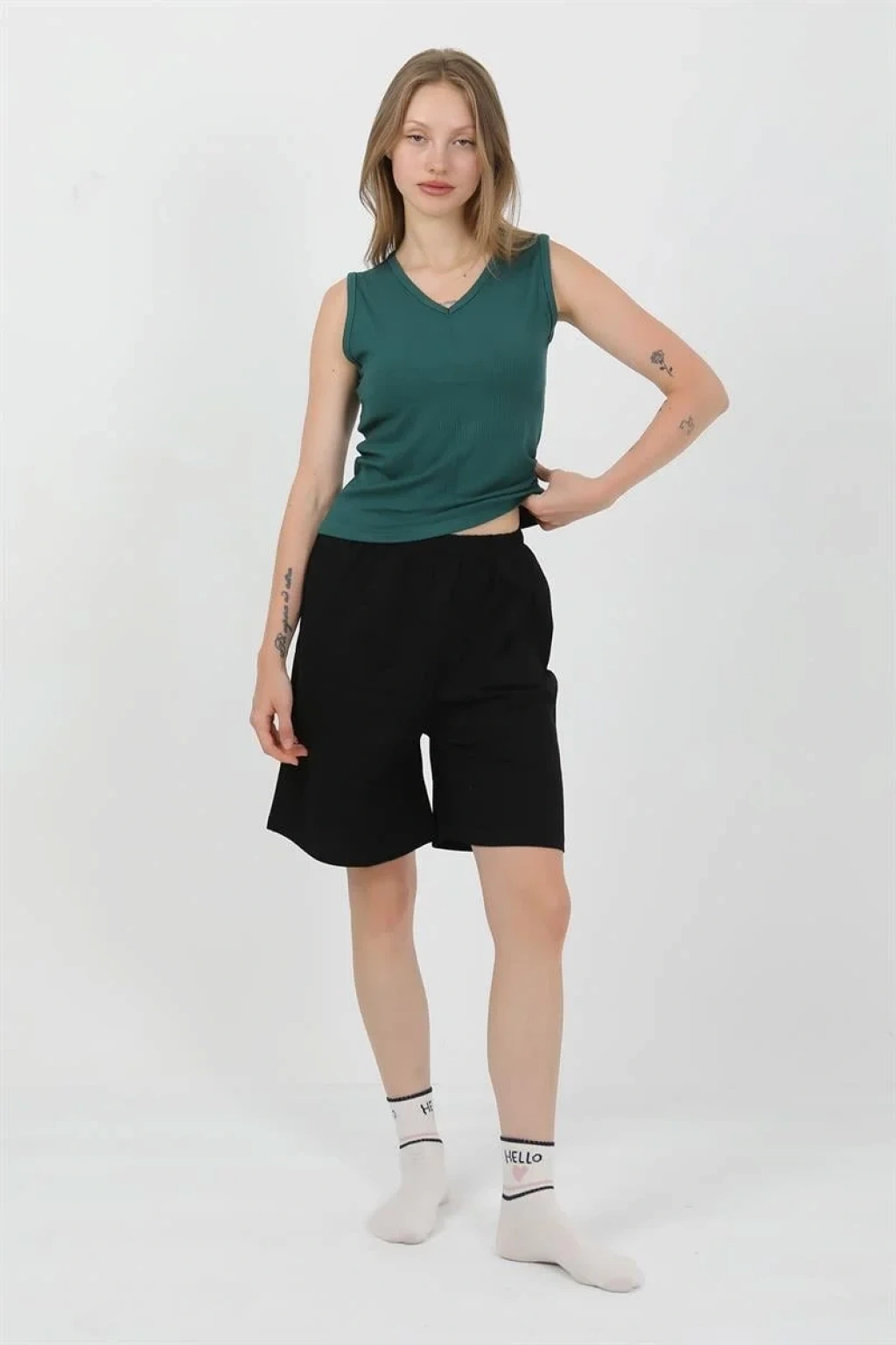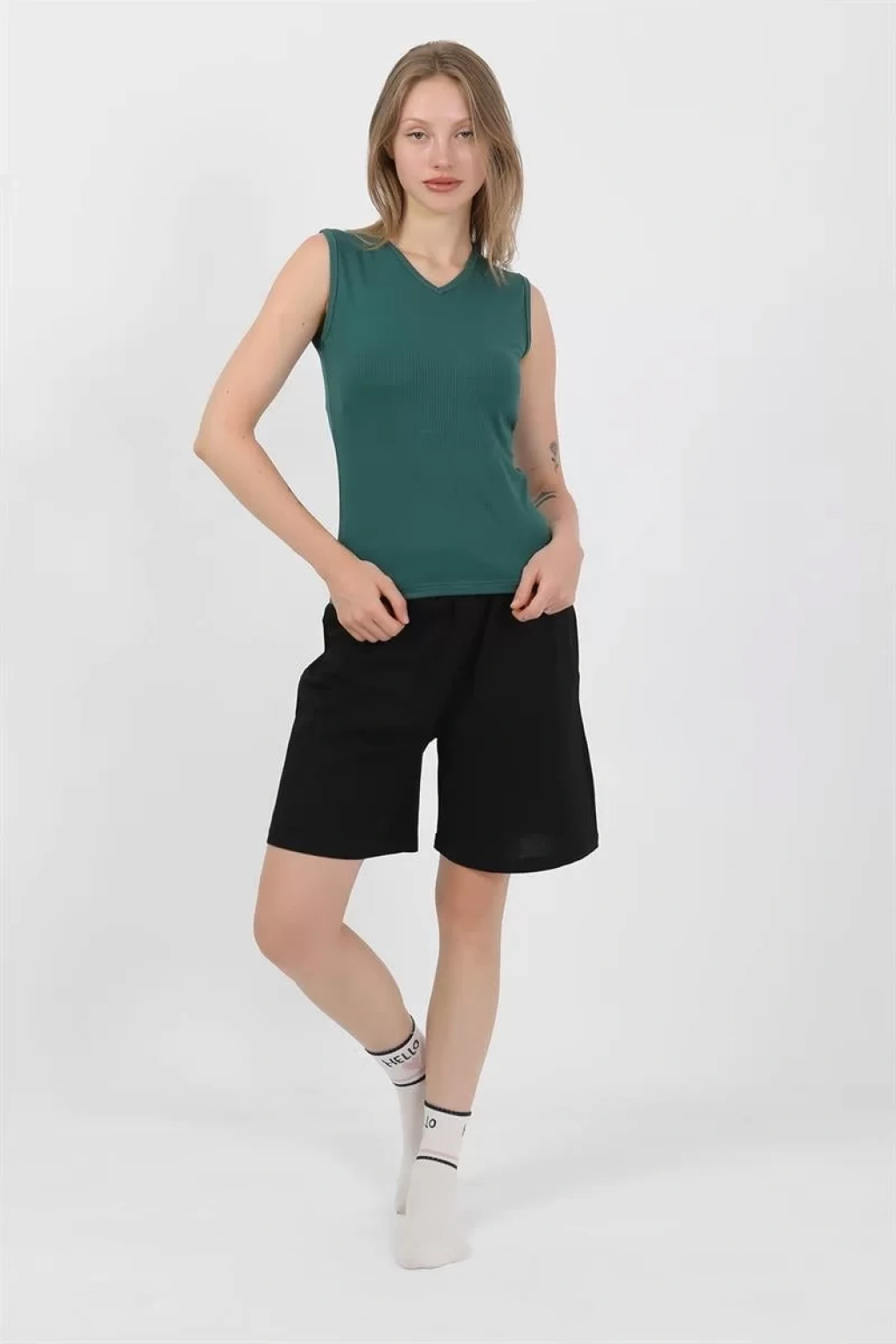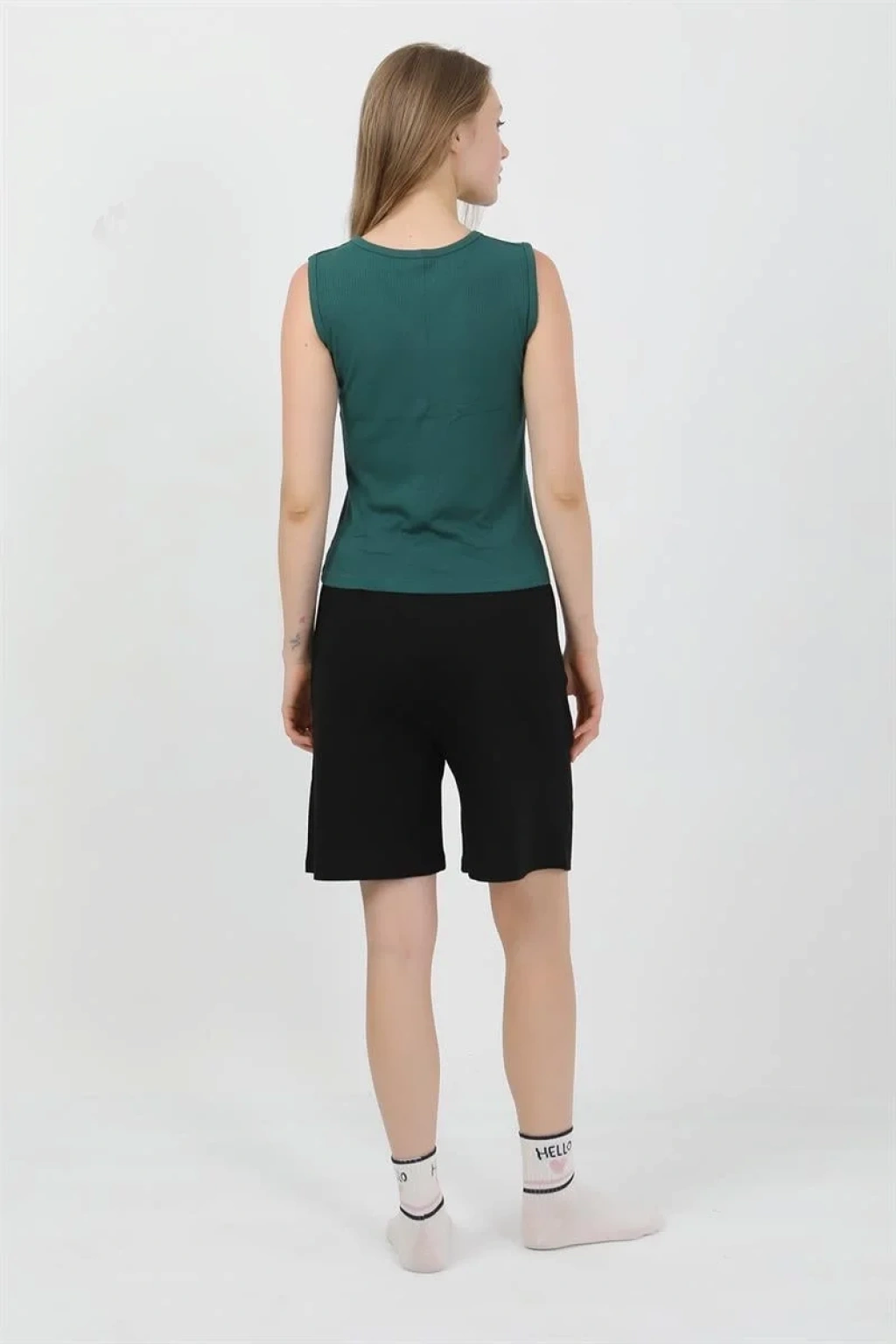 Yüksek kaliteli pamuk penye malzemeden üretilen üst kısmı, kalın askıları ile hem modern hem de şık bir görünüm sunuyor. Üst kısmın uyumlu olduğu kısa şort ise rahat kesimi ve kalın kumaşıyla gün boyu konfor sağlıyor.