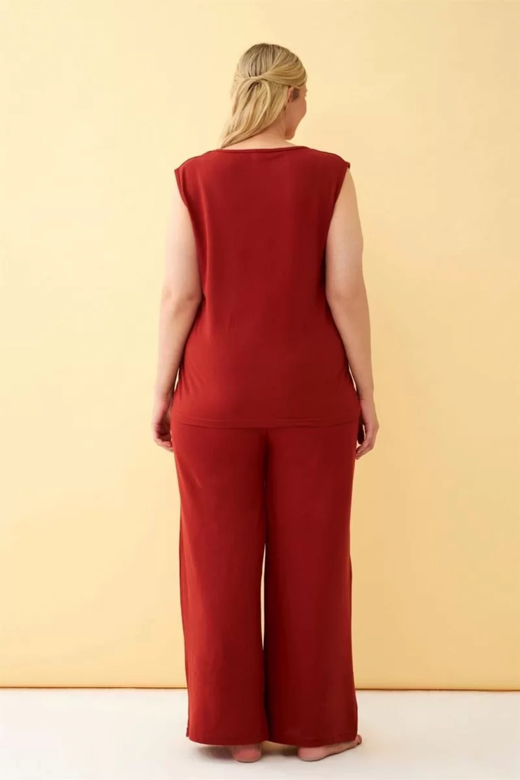 Özel penye kumaşı sayesinde gün boyu konforlu bir kullanım sağlayan bu alt üst takım, kiremit rengiyle dikkat çekici bir görünüm sunuyor. Hem günlük kullanıma uygun hem de özel davetlerde tercih edebileceğiniz şık detaylarıyla her ortama kolaylıkla uyum sağlıyor.
