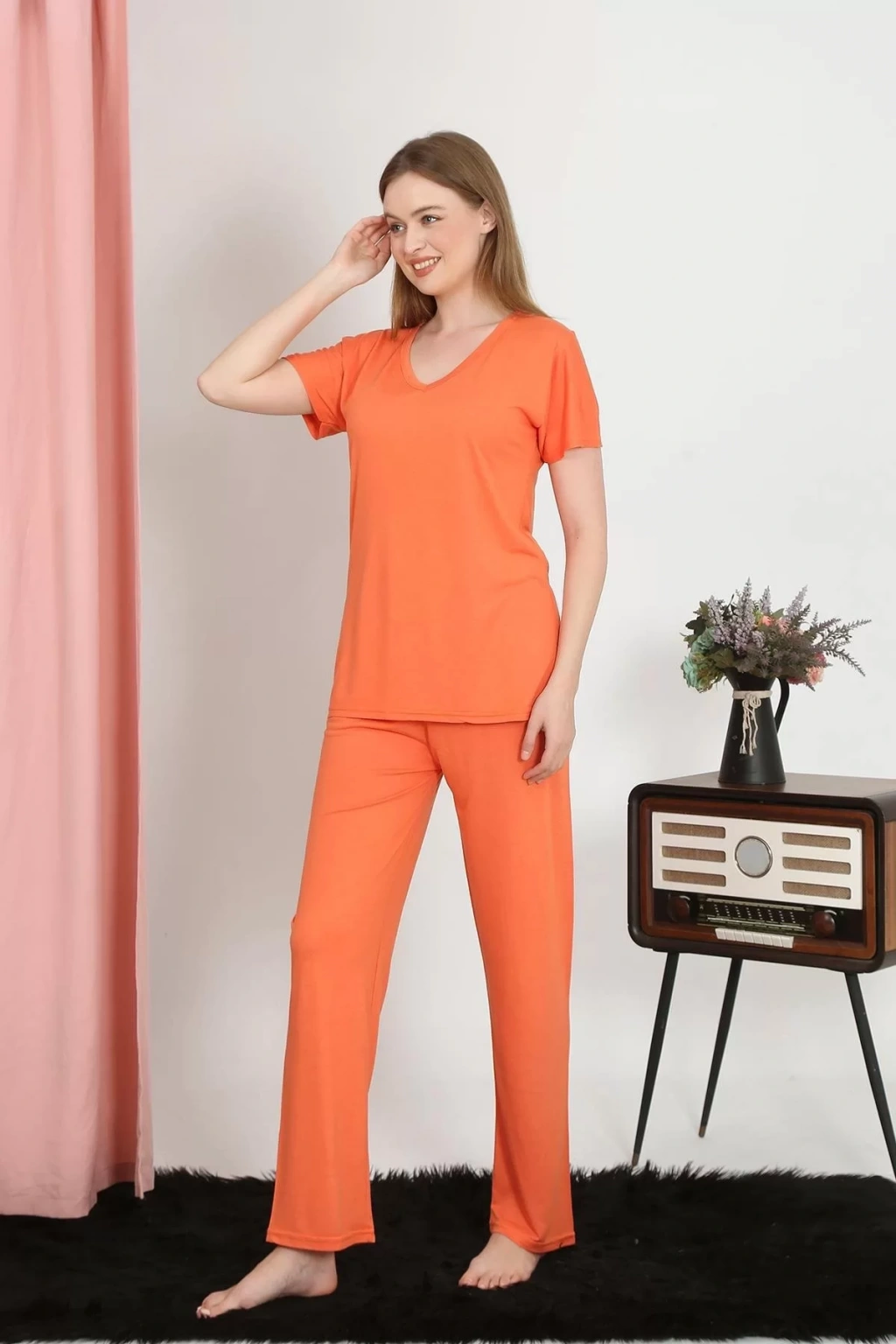 Moda Kadın Kısa Kol Pamuk Penye Pijama Takım Turuncu