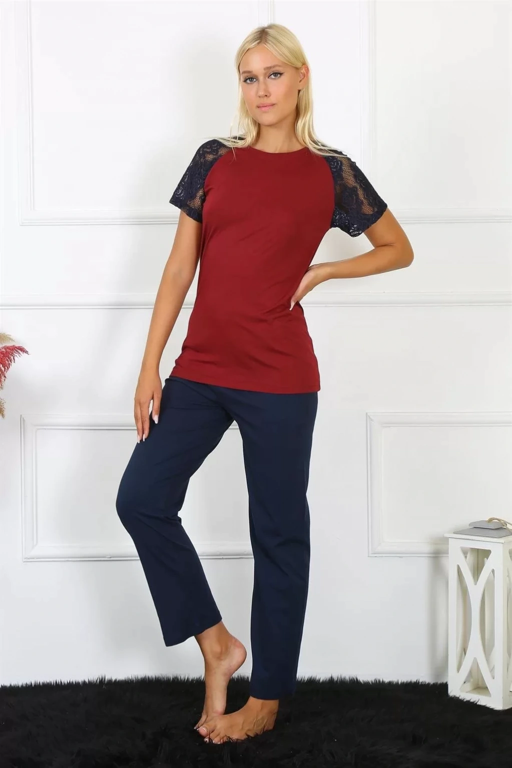 Çamaşır Kenti marka Kadın Kolu Dantelli Penye Pijama Takımı Bordo, şıklığı ve rahatlığı bir arada sunar.