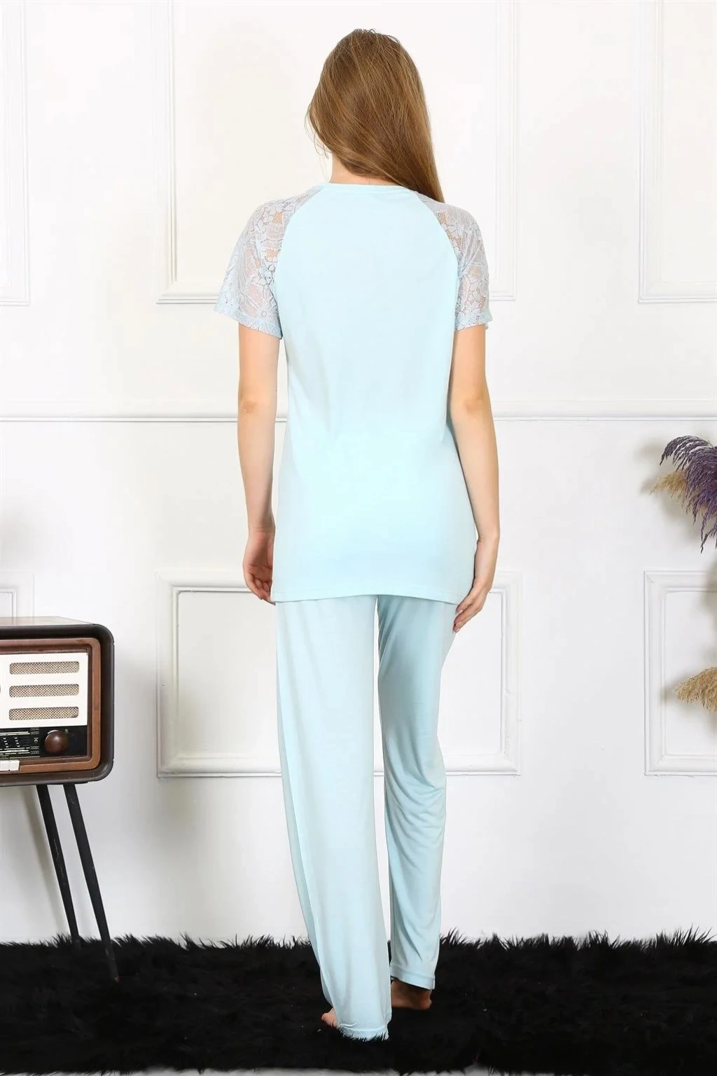 Şıklık ve rahatlığı bir arada sunan Çamaşır Kenti Kadın Kolu Dantelli Penye Pijama Takımı Su Yeşili, günün yorgunluğunu atmaya yardımcı olacak enfes bir seçenektir. İnce penye kumaşıyla teninizde hafif bir dokunuş sağlarken, dantel detaylarıyla da şık bir görünüm sunar.