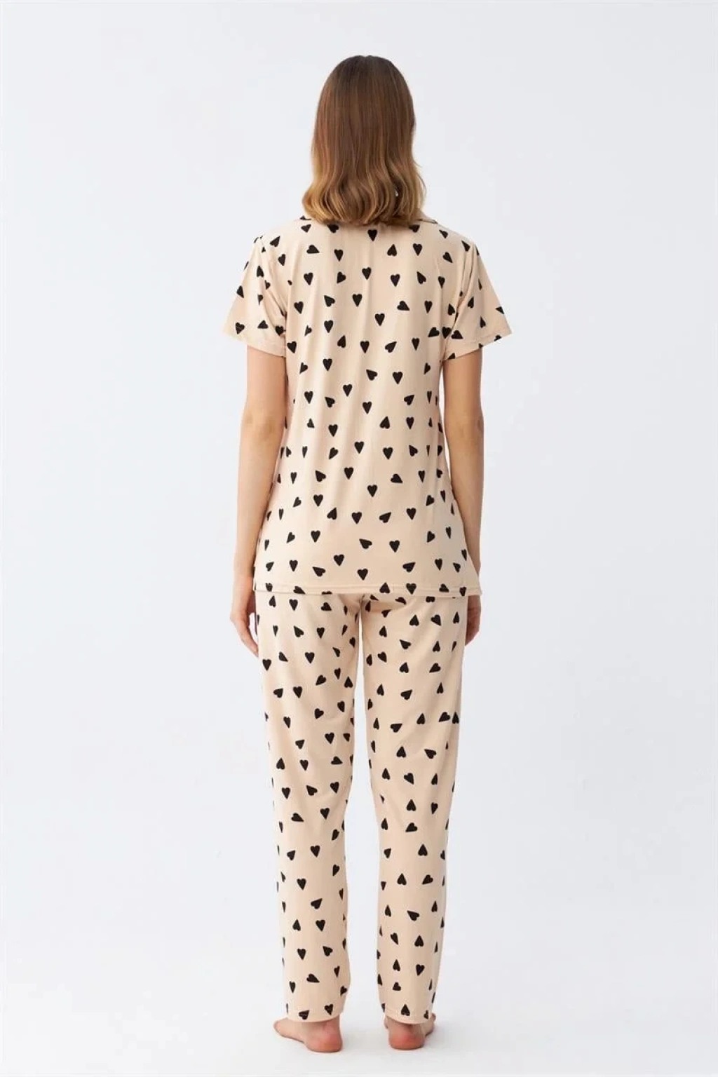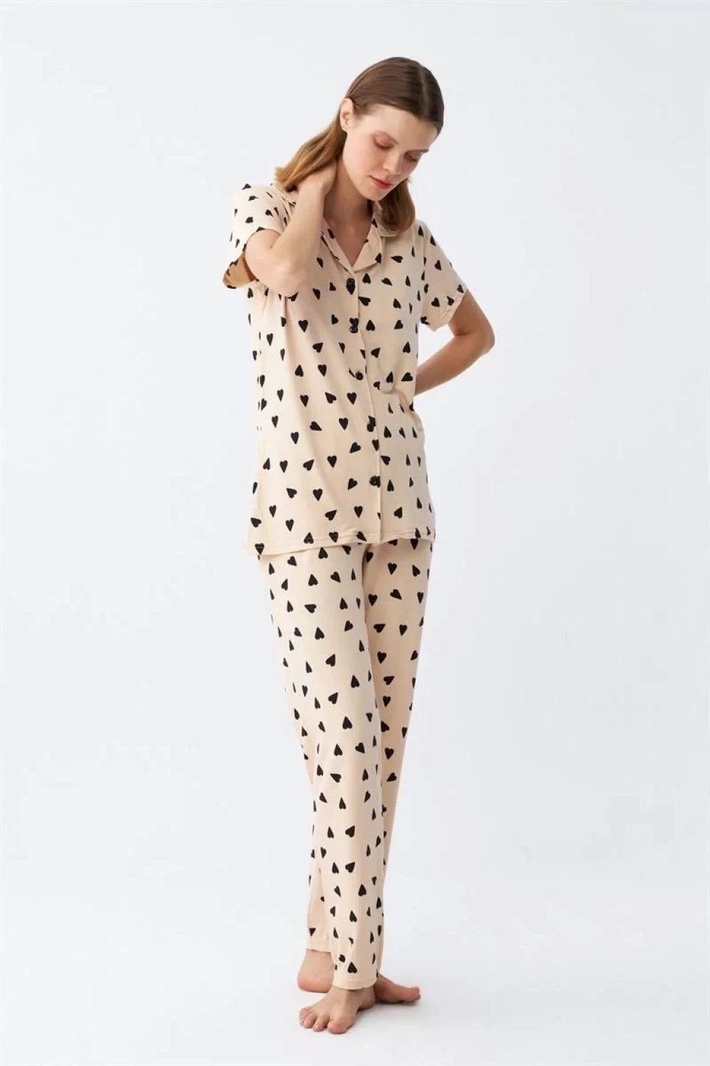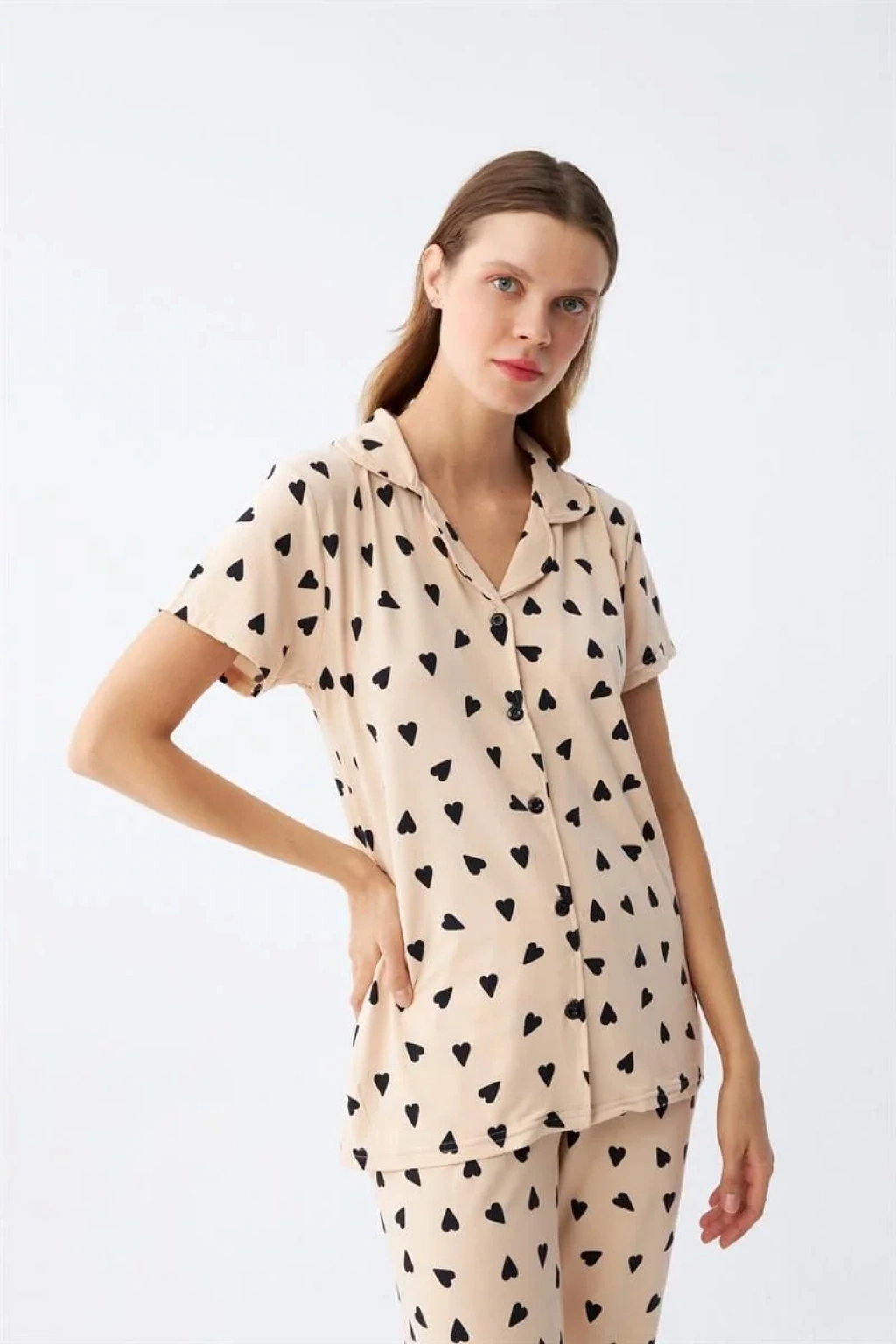 Çamaşır Kenti markasının özel tasarımı olan Kadın Krem Rengi Kalp Desenli Önden Düğmeli Pijama Takımı, kullanışlı ve şık bir seçenektir.