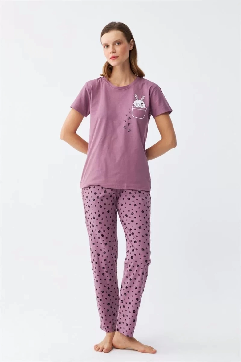 Kadın Mor Patili Tavşan Baskılı Cepli Pijama Takımı, günlük kullanıma uygun ve yıkanabilir özellikleriyle de dikkat çekiyor. Şimdi sipariş vererek bu şık ve konforlu pijama takımına sahip olabilirsiniz.