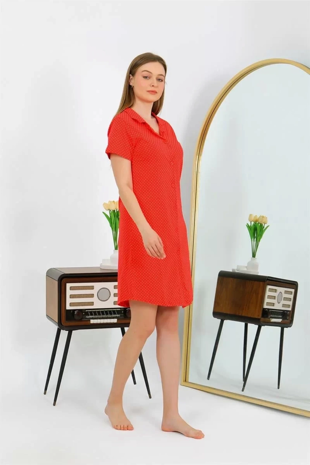 Bu şık Kırmızı Tunik Gecelik, Çamaşır Kenti kalitesiyle artık gardırobunuzdaki vazgeçilmez parçalardan biri olmaya aday! Pamuk penye kumaşıyla hem şıklığı hem de rahatlığı bir arada sunan bu ürün, kısa kollu tasarımı ve düğmeli detaylarıyla dikkat çekiyor. Geceleri rahatça kullanabileceğiniz bu tunik gecelik, sizi hem şık hem de konforlu hissettirecek. Penye gecelik kategorisinde yer alan bu ürünü hemen sepetinize ekleyin ve konforun keyfini yaşayın!