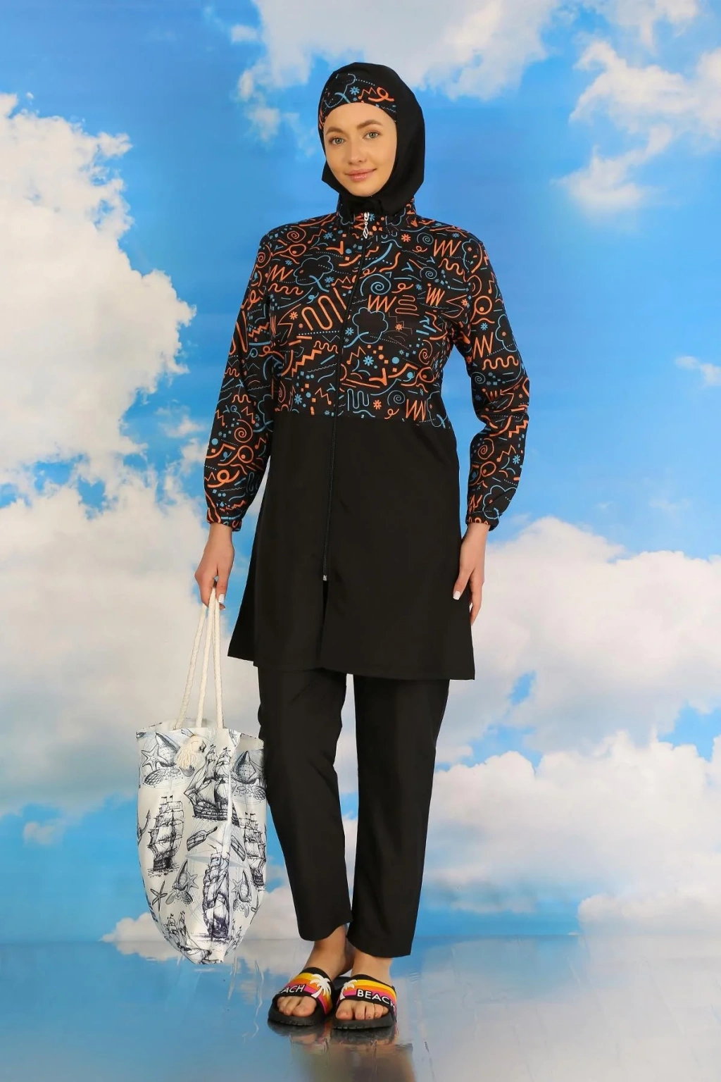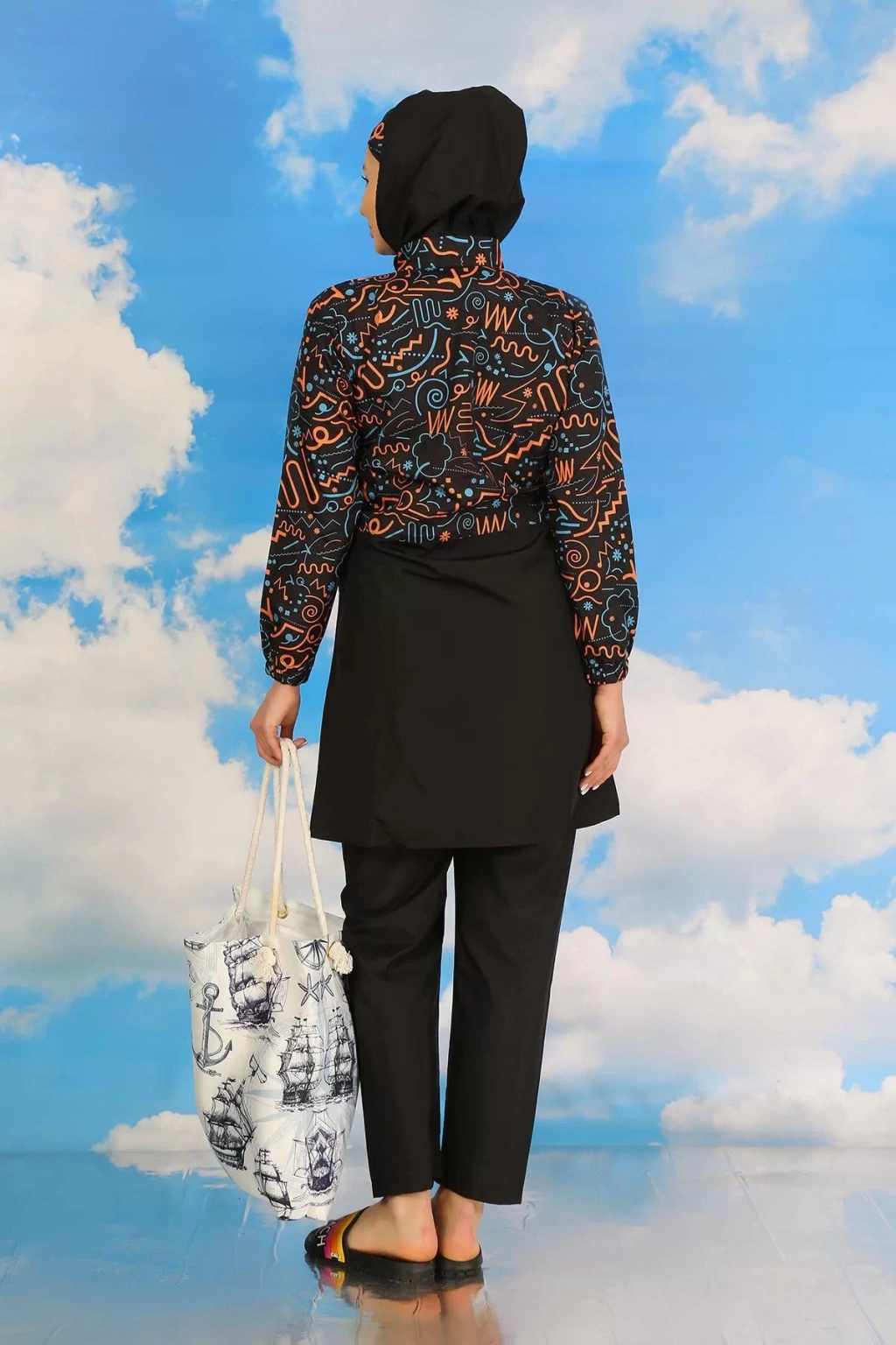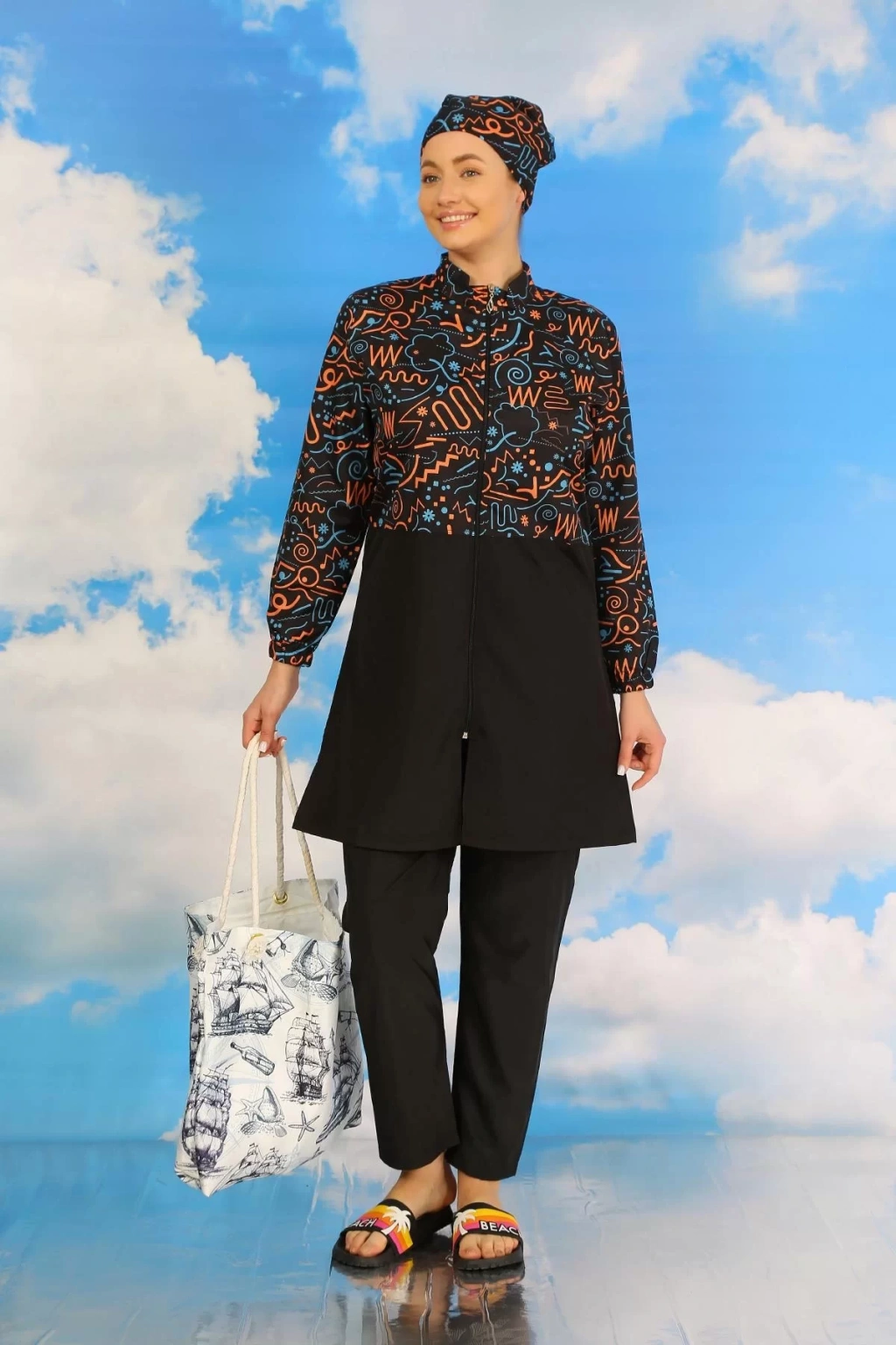Çamaşır Kenti markasıyla öne çıkan Kadın Pantolonlu Desenli Tam Tesettür Mayo Siyah, plajda rahat ve şık bir görünüm sunar.