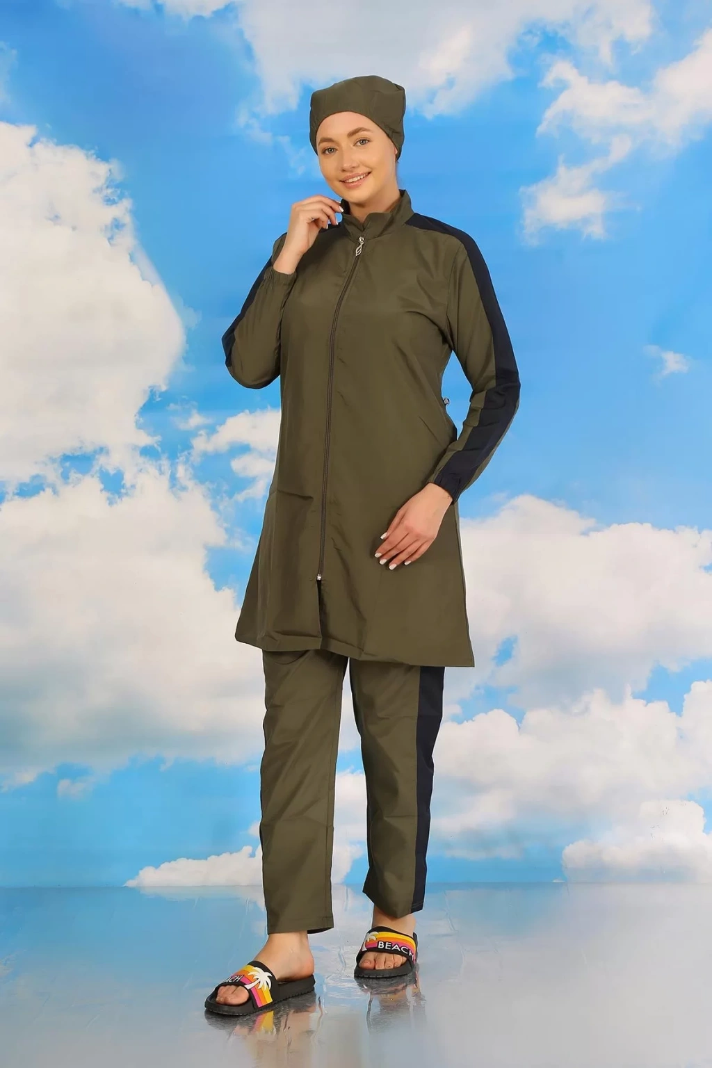 Çamaşır Kenti'nin özel tasarımı olan Kadın Pantolonlu Kolu Şeritli Tam Tesettür Mayo Haki, plaj şıklığınızı tamamlayacak mükemmel bir seçenektir.