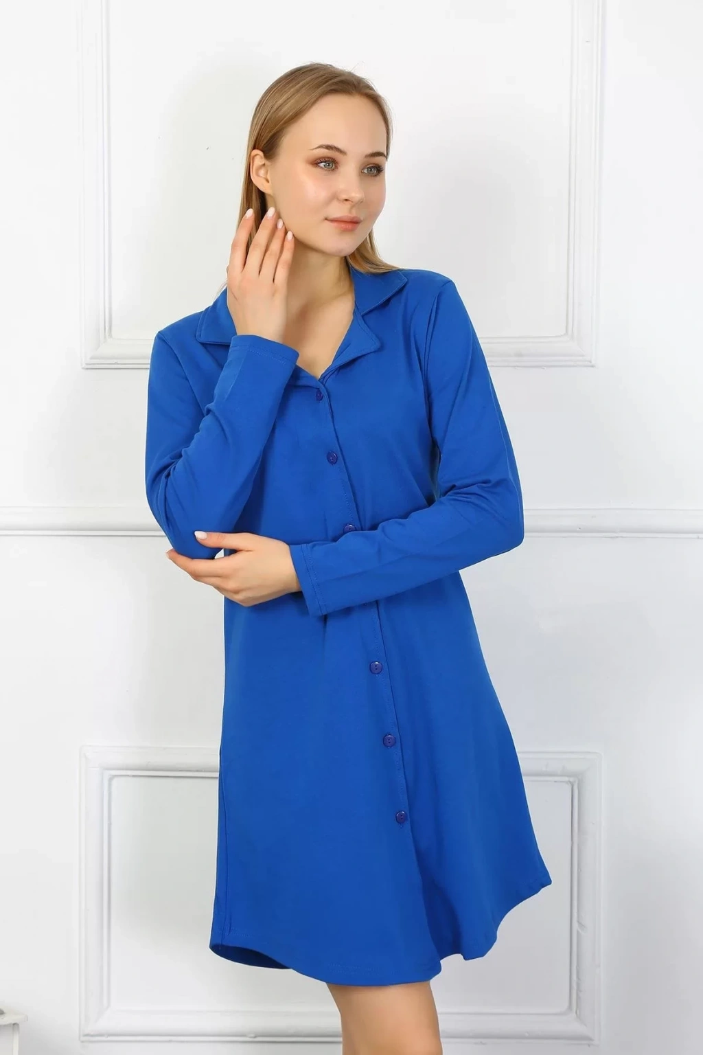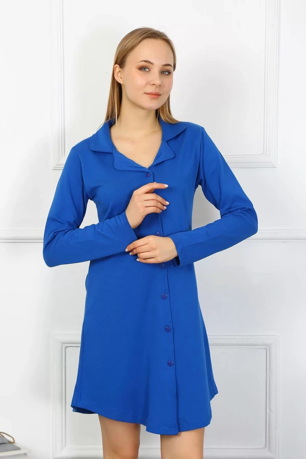 Çamaşır Kenti markasının kadın penye uzun kol düğmeli saks tunik geceliği, şıklık ve konforu bir arada sunar.