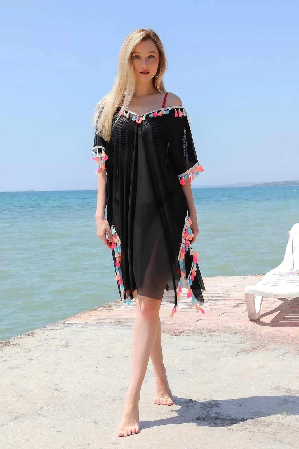 Moda Kadın Püsküllü Tunik Pareo Plaj Elbisesi Siyah