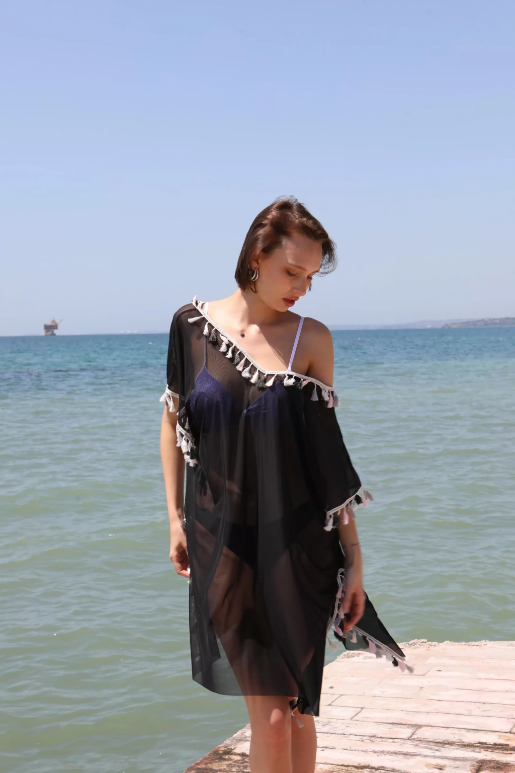Moda Kadın Püsküllü Tunik Pareo Plaj Elbisesi Siyah