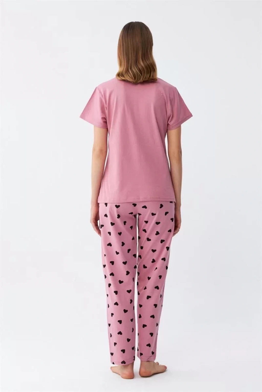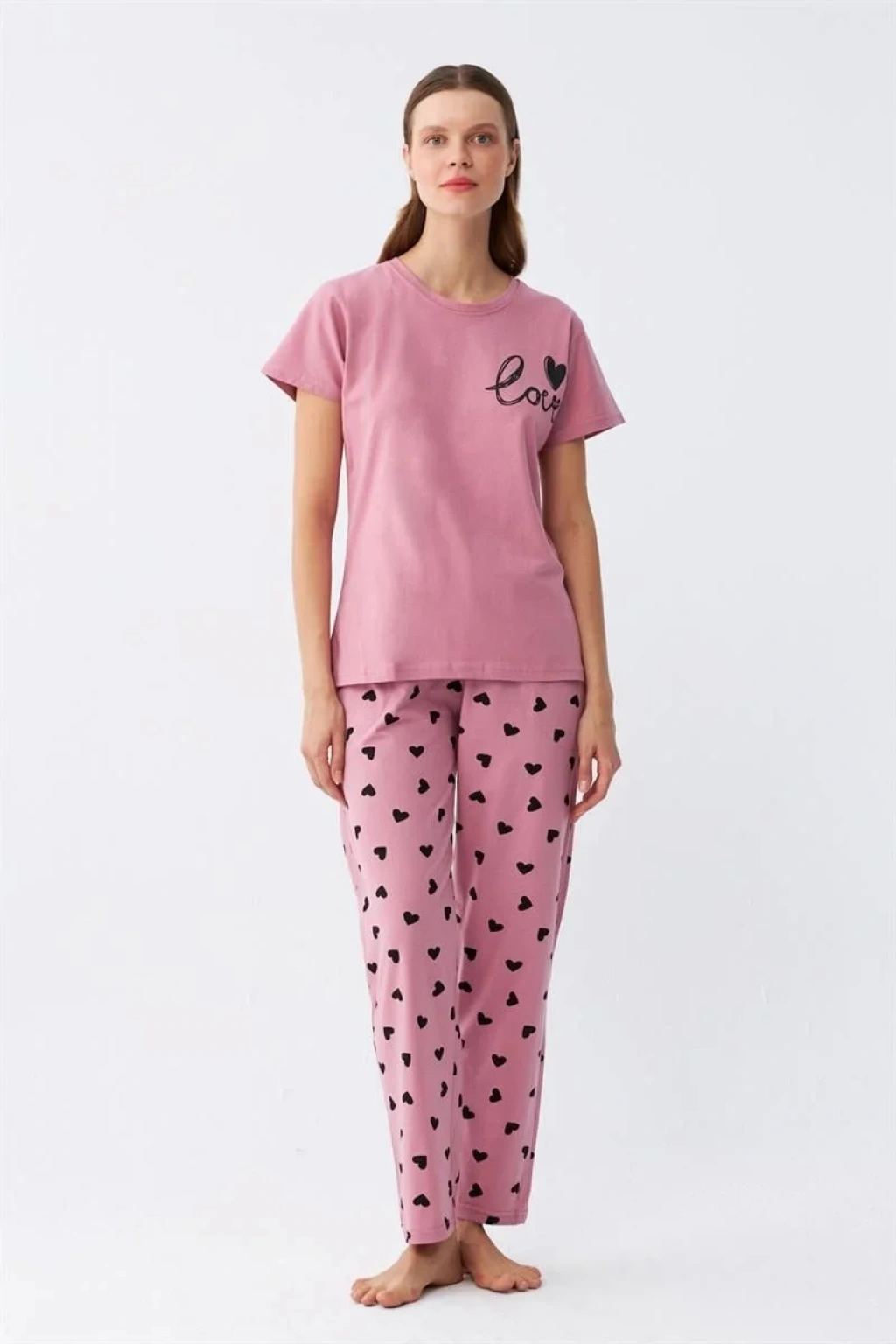 Kısa kollu üstü, kalp desenli şık tasarımıyla dikkat çekerken, şortu ise salaş kesimiyle konfor sunar.