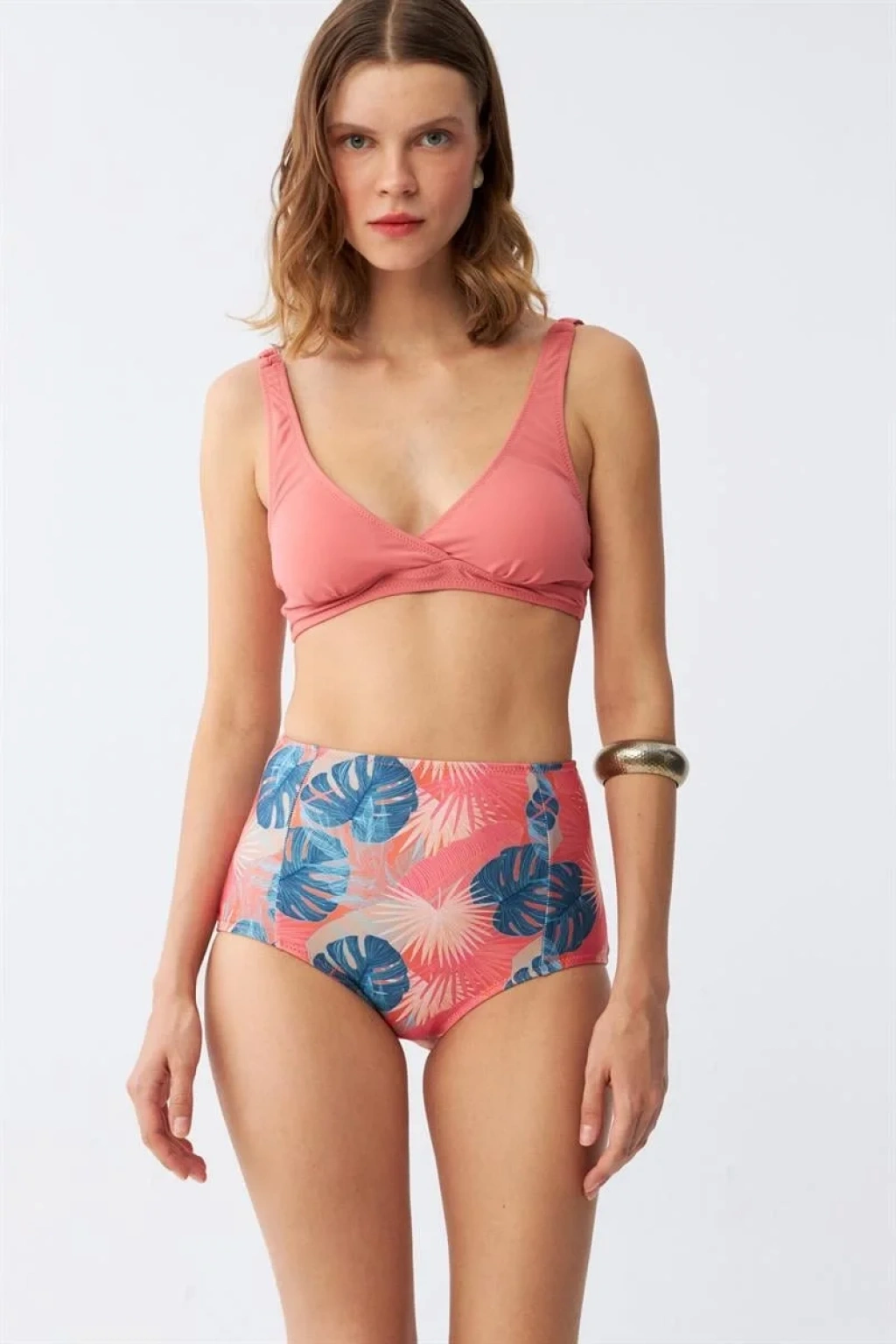 Çamaşır Kenti Kadın Somon Pedli Üst ve Tropik Desenli Yüksek Bel Bikini Takımı, plajda şıklığı ve rahatlığı bir arada arayan kadınların favorisi olacak.