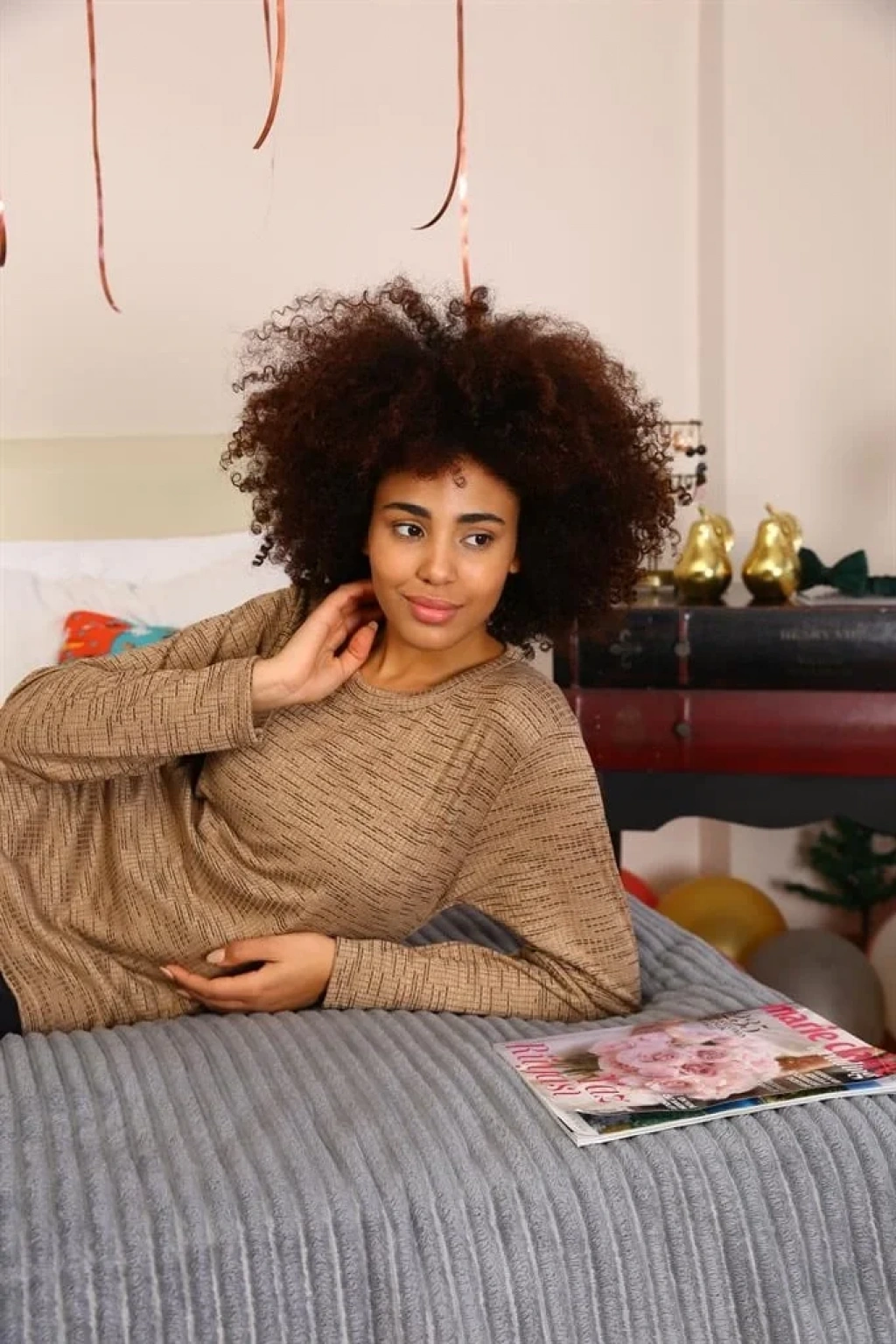 Çamaşır Kenti marka Sütlü Kahve rengindeki Kadın Uzun Kol Penye Pijama Takımı, hem şıklığı hem de rahatlığı bir arada sunar. Bu takım, kaliteli penye kumaştan üretilmiştir ve yumuşacık dokusuyla cildinize rahatlık sağlar.