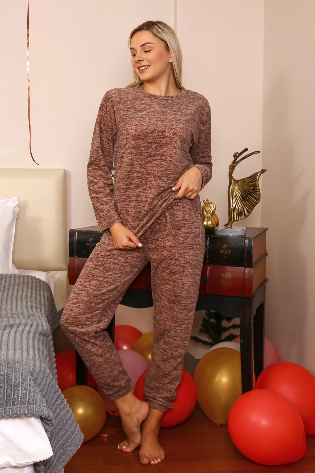 % 100 Polyester Polar Kadın Pijama Takımı Mankenin üzerindeki beden M bedendir.
