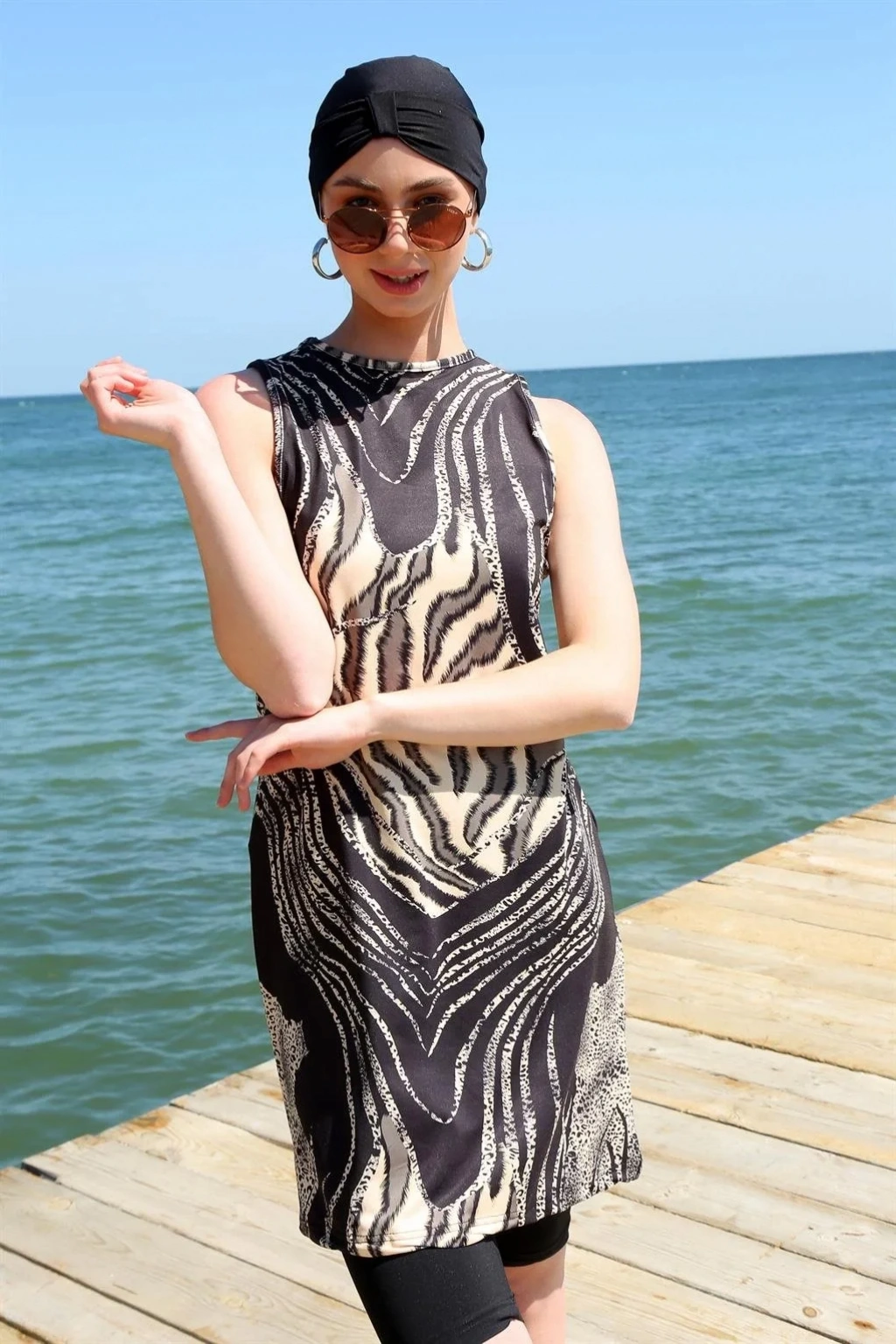 Tesettür plaj giyiminde tarzınızı yansıtmak ve kendinizi özgürce ifade etmek için Çamaşır Kenti Sıfır Kol Leopar Yarım Tesettür Mayo Siyah tercih edebilirsiniz.