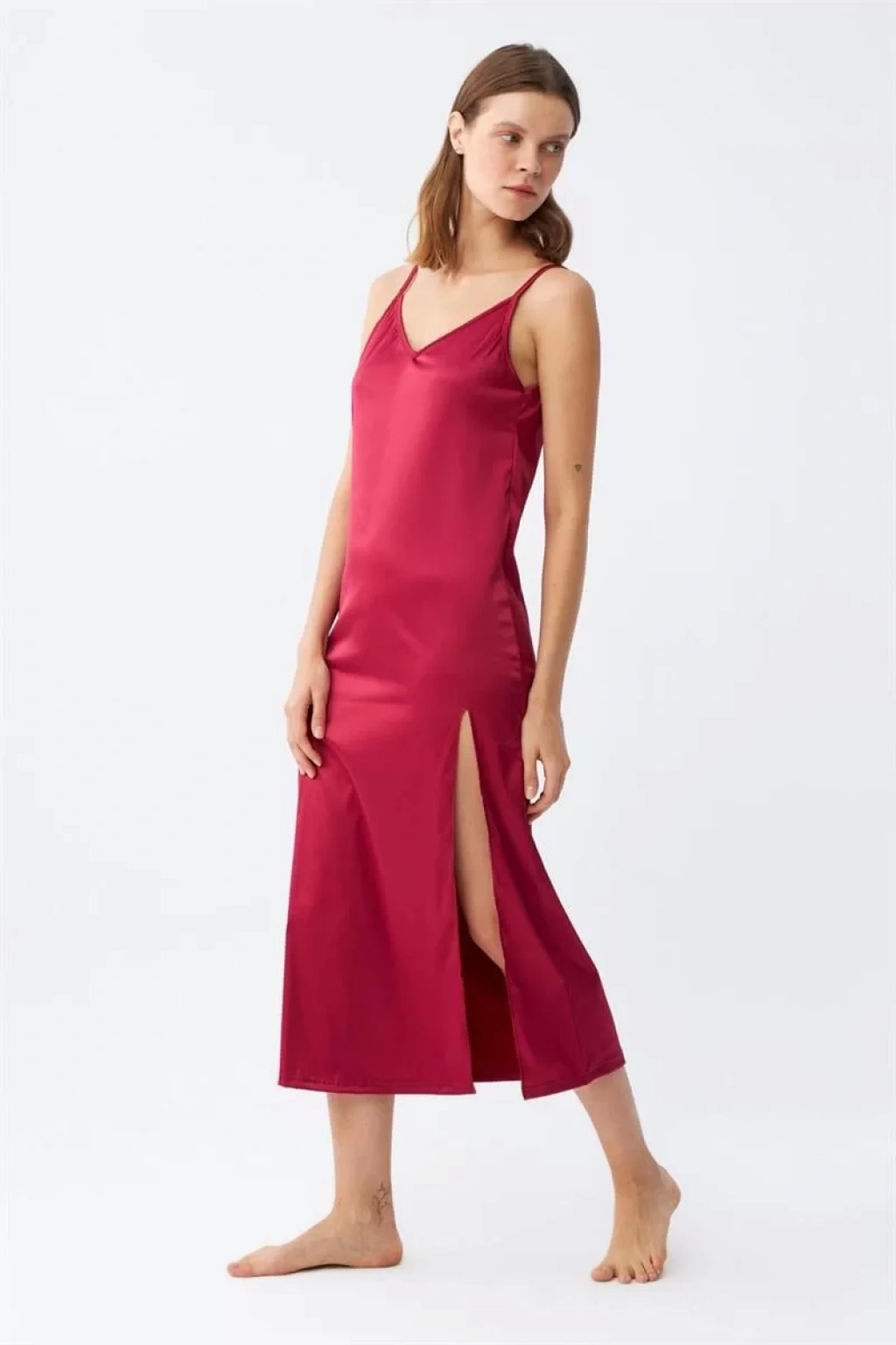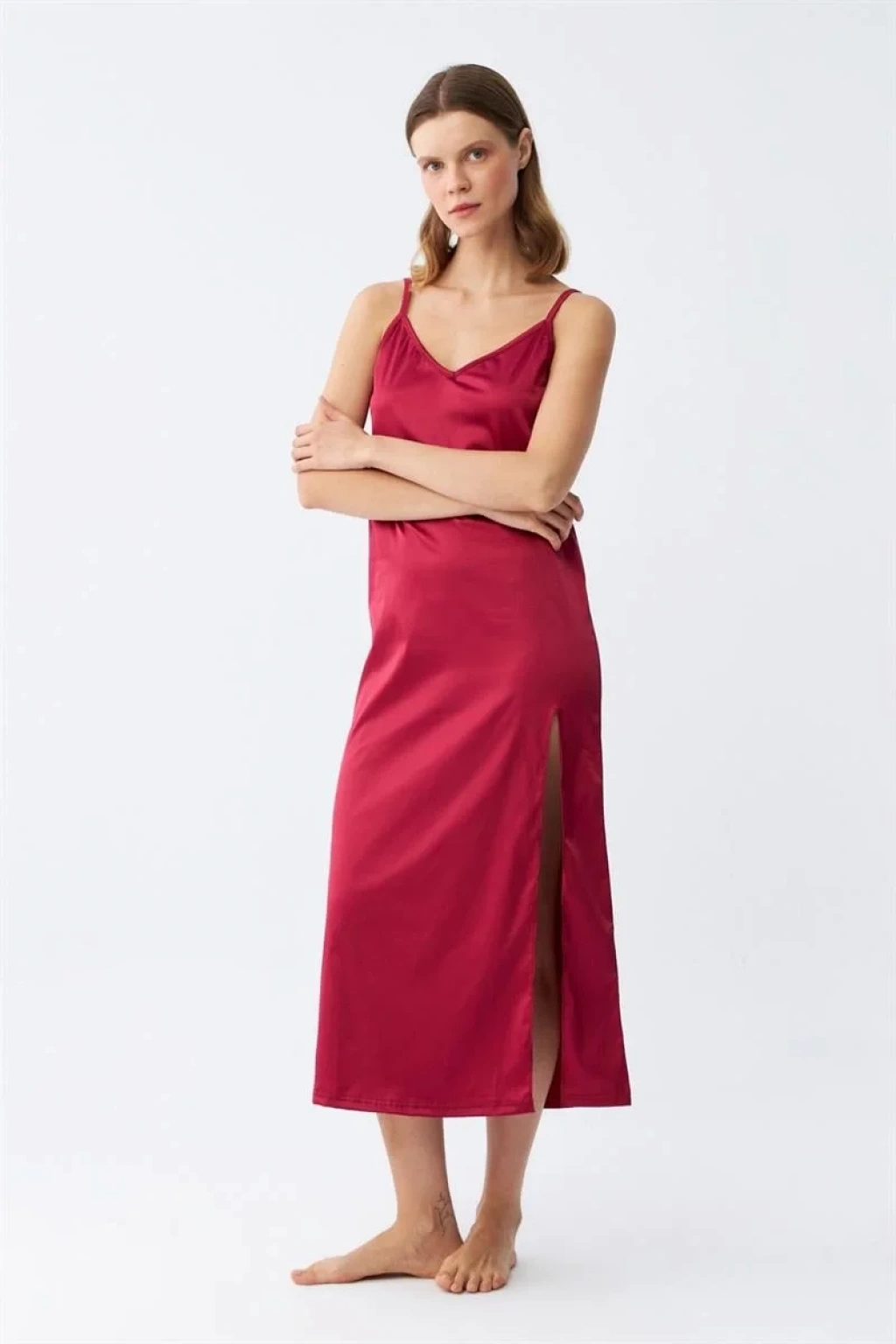 Gecenize ihtişam katmak ve kendinizi özel hissetmek için Yırtmaçlı Uzun Saten Gecelik Bordo tam size göre!