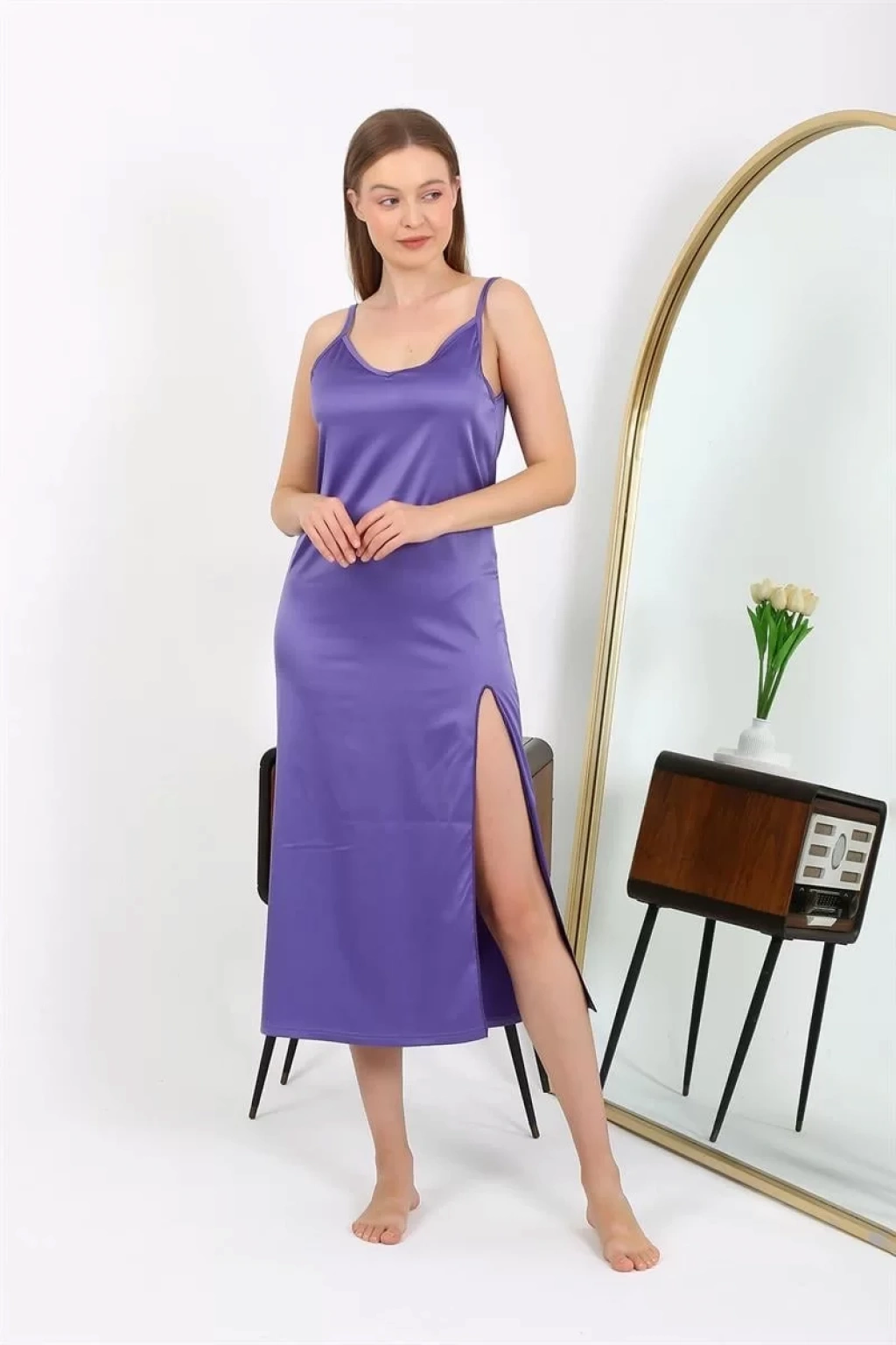Çamaşır Kenti'nin yepyeni tasarımı olan Yırtmaçlı Uzun Saten Gecelik Mor ile kendinizi şıklığın ve rahatlığın kusursuz uyumuyla ödüllendirin.