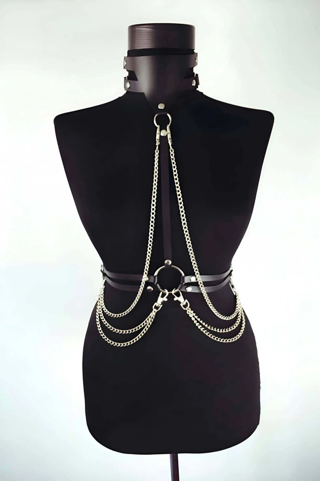 Siyah Harness Takım Zincir Detaylı Bileklik Bağlantılı Deri - Brf270