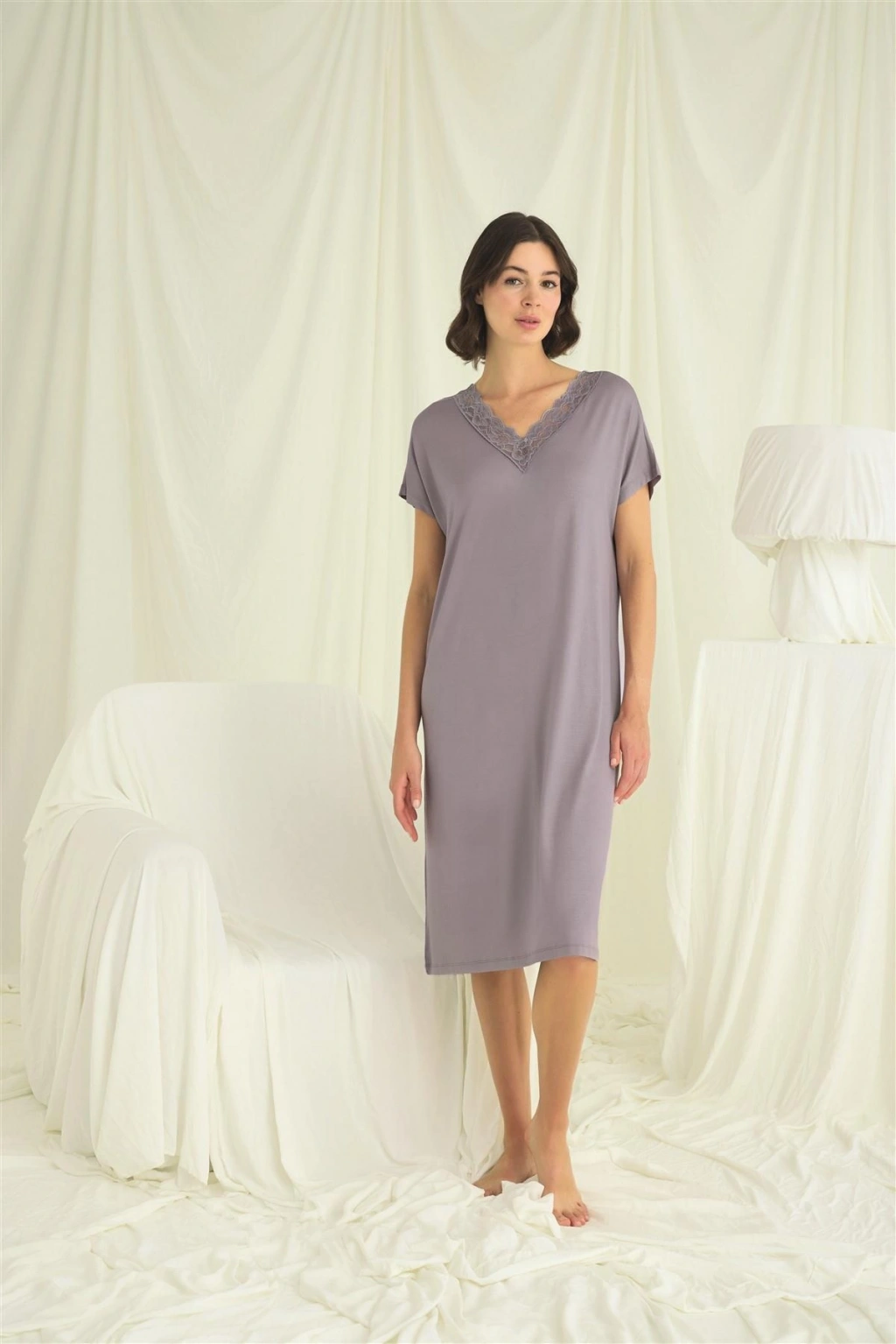 Gecelik: V yakalıdır, kısa kolludur, yakası dantellidir, Gri renklidir, örme kumaştır.Materyal%94 Viskon %6 Elastan